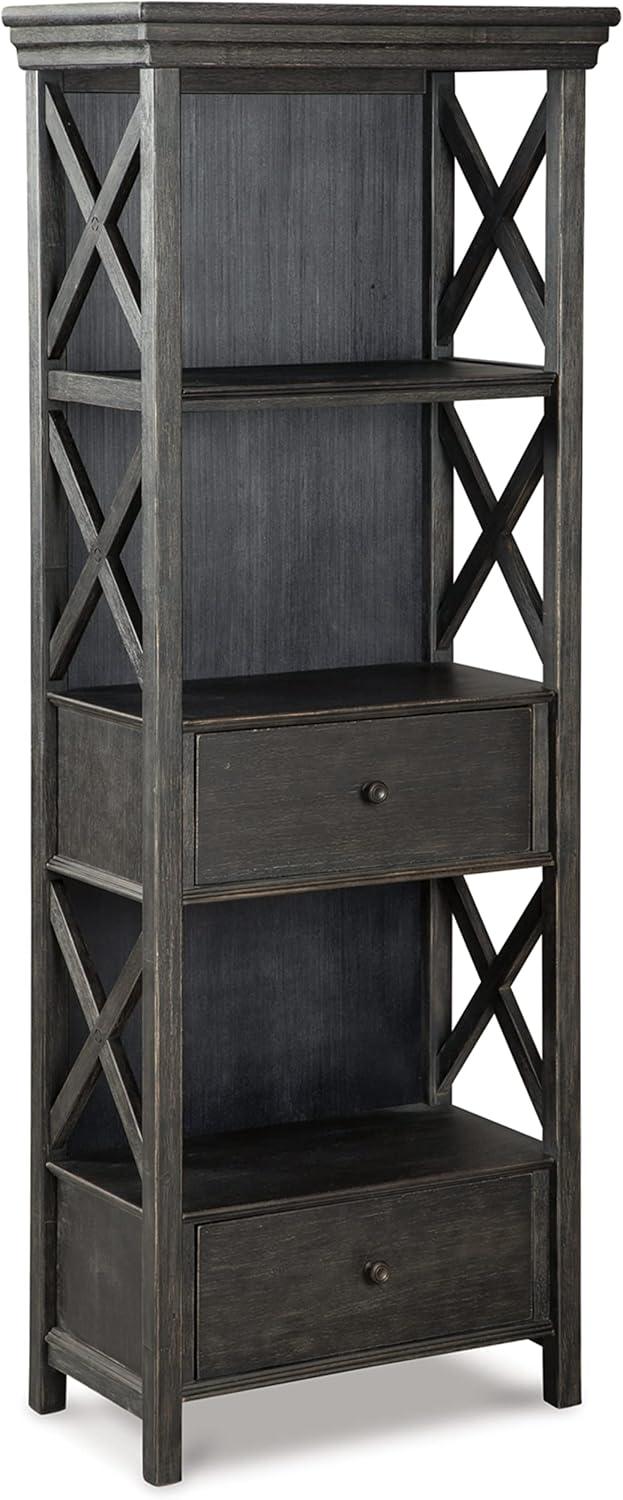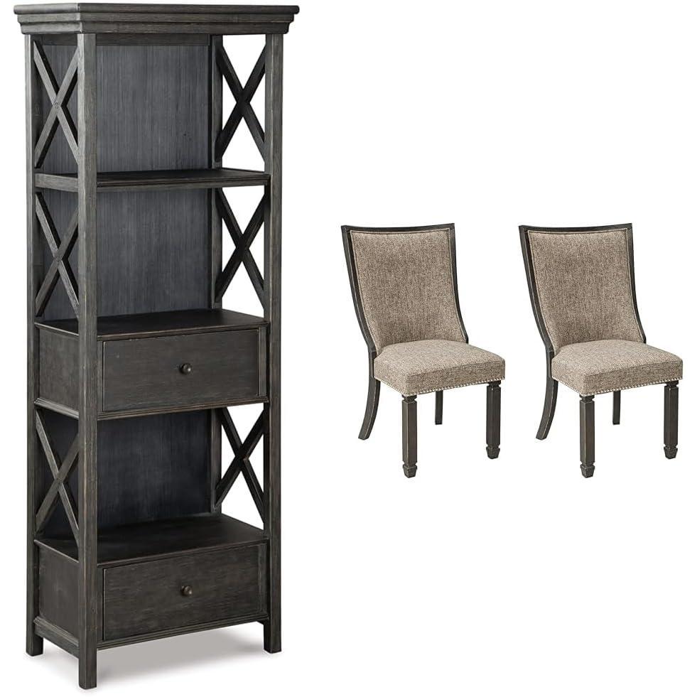 This stylish 2-piece dining bundle from Ashley Furniture's Tyler Creek Farmhouse collection blends modern industrial and rustic farmhouse elements to create an eye-catching ensemble perfect for family dining areas. The anchor piece is a commanding 75-inch tall display cabinet with an almost black finish featuring a handsomely textured look. Its defining X-shape sides and antiqued bronze tone hardware lend unique visual interest while the roomy drawers and shelf provide ample storage for dinnerware, décor and essentials. Complementing the cabinet are a set of two matching upholstered side chairs with framed backs and tapered legs in the collection’s signature almost black finish. The chairs feature lush heavily woven polyester upholstery and silver nailhead trim for subtle industrial edge. Together these pieces create the ideal foundation for a cozy yet modern dining nook that brings loved ones together for memorable meals and conversations.