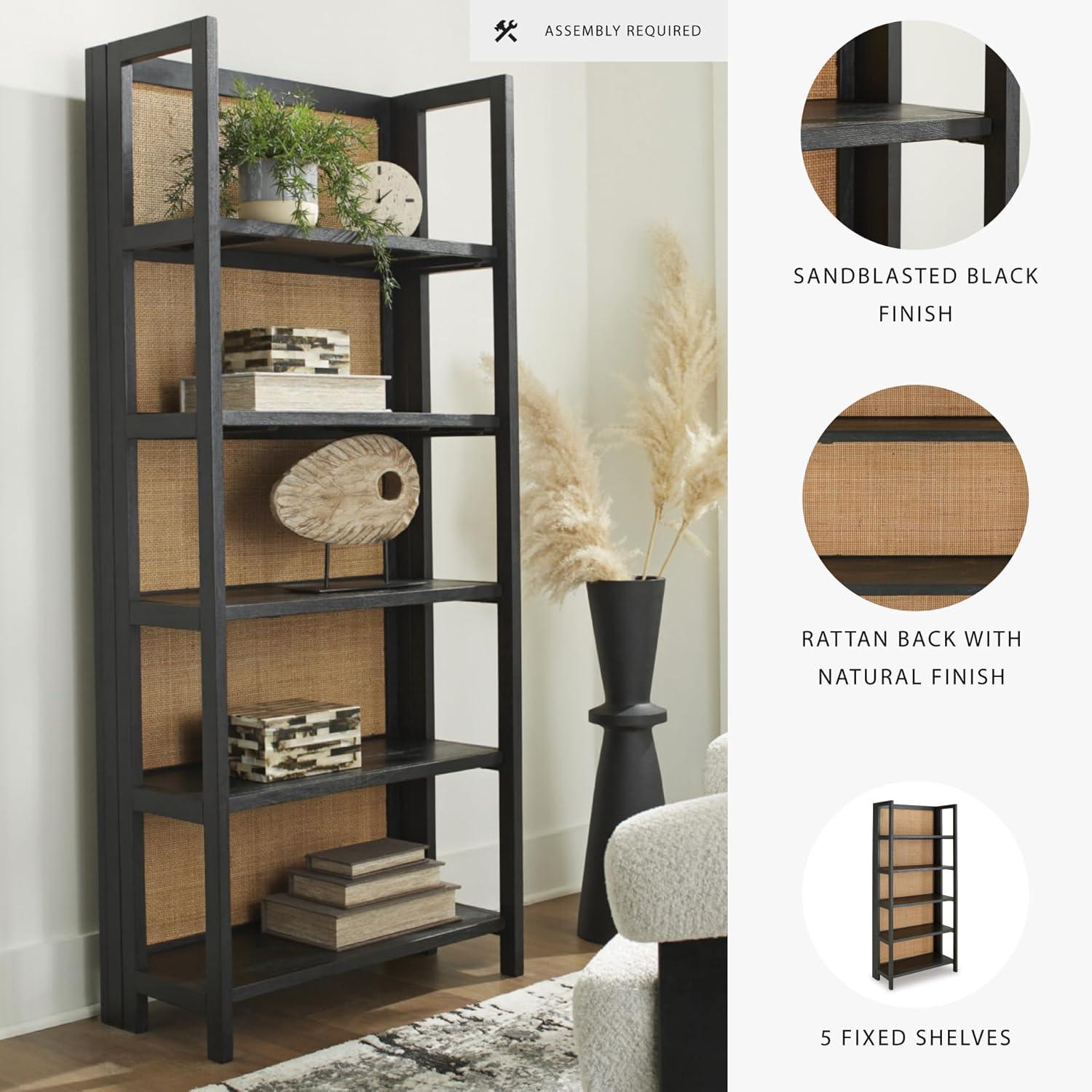 HANDSOMELY CRAFTED: Made with solid and engineered woods. Rattan back with natural finish. Sandblasted black finish. 5 fixed shelves