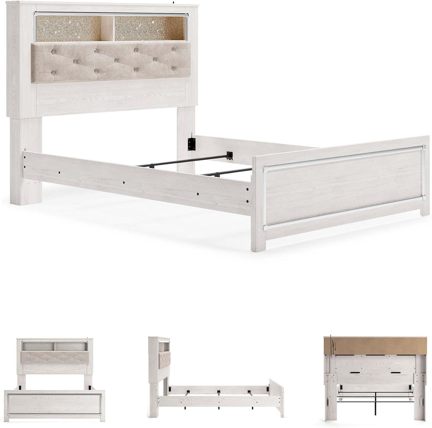 Signature Design by Ashley Altyra Contemporary Adjustable Tufted Full Upholstered Panel Bed with LED Lights and Metal Slats, Foundation or Box Spring Needed, White & Gray(Queen Panel Bookcase Bed)