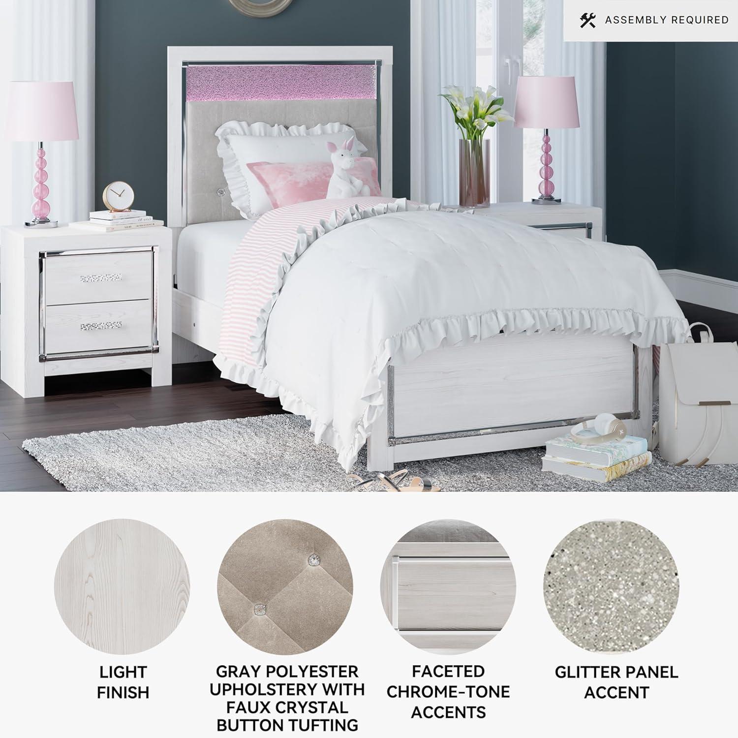 QUALITY MADE: Made of engineered wood & decorative laminate. Light finish & pearl effect over replicated cedar grain. Gray polyester upholstery & faux crystal button tufting. Glitter panel inset bookshelf, faceted accents, LED light strip & remote
