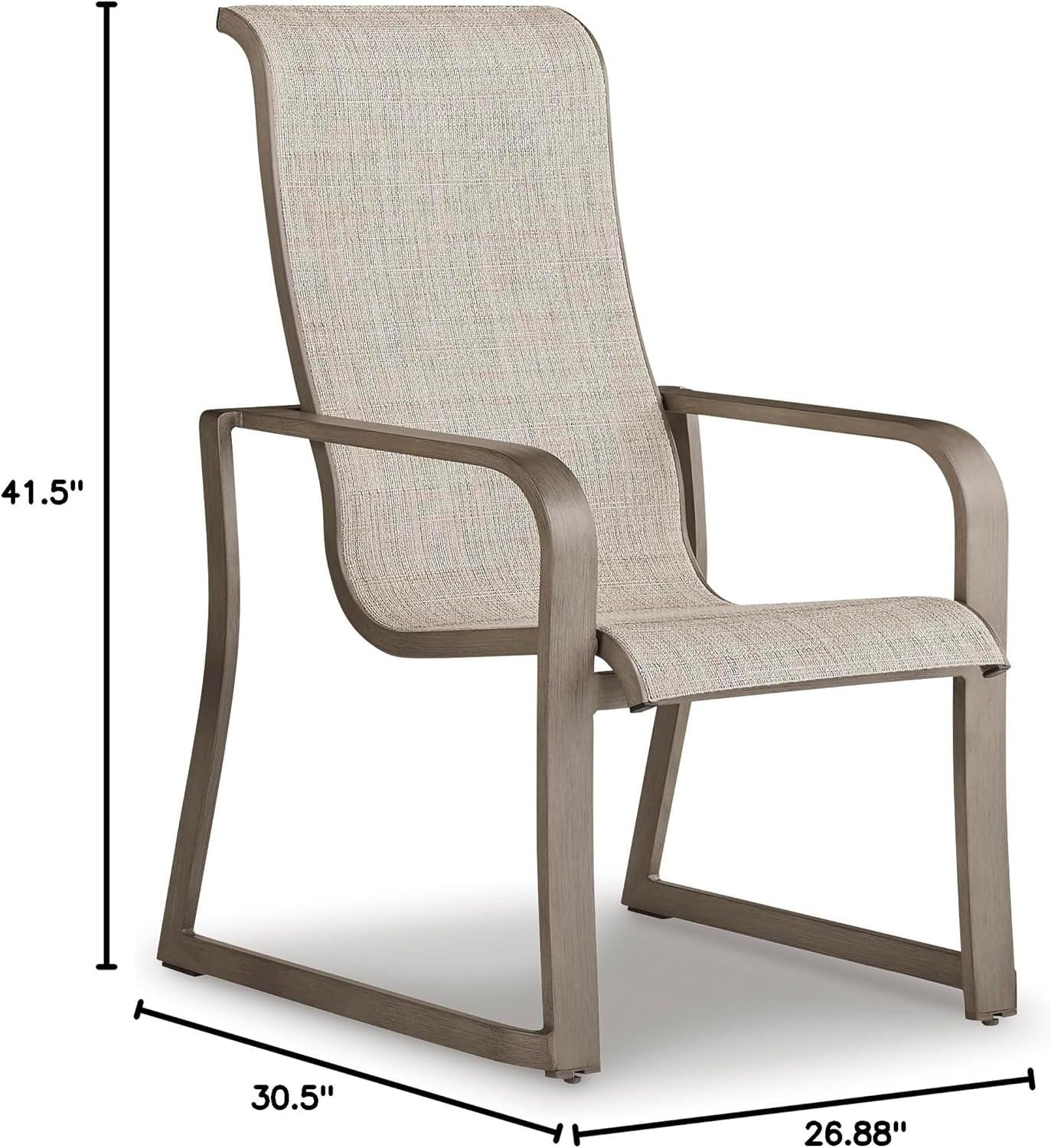 Balancing effortless natural beauty and minimalist design, this sling arm chair seamlessly brings your contemporary style outdoors. Sporting a sled base design and wood-look finish, it entices with a fresh-feeling neutral sling fabric over the high back. This sleek yet durably made chair refines the art of relaxed outdoor living. Signature Design by Ashley is a registered trademark of Ashley Furniture Industries, Inc.