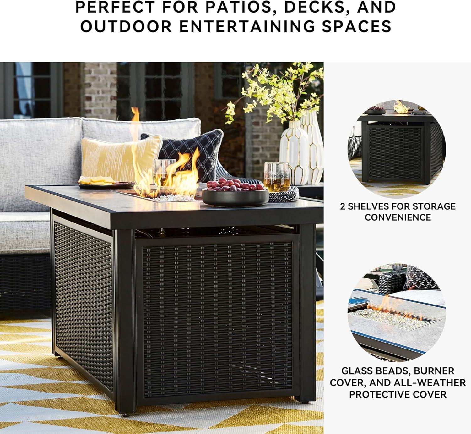 ENTERTAINMENT CENTRAL: Ideal for a casual outside dining area. Includes gas firepit table with CSA-approved 30,000 BTU stainless steel burner, glass beads and all-weather protective cover