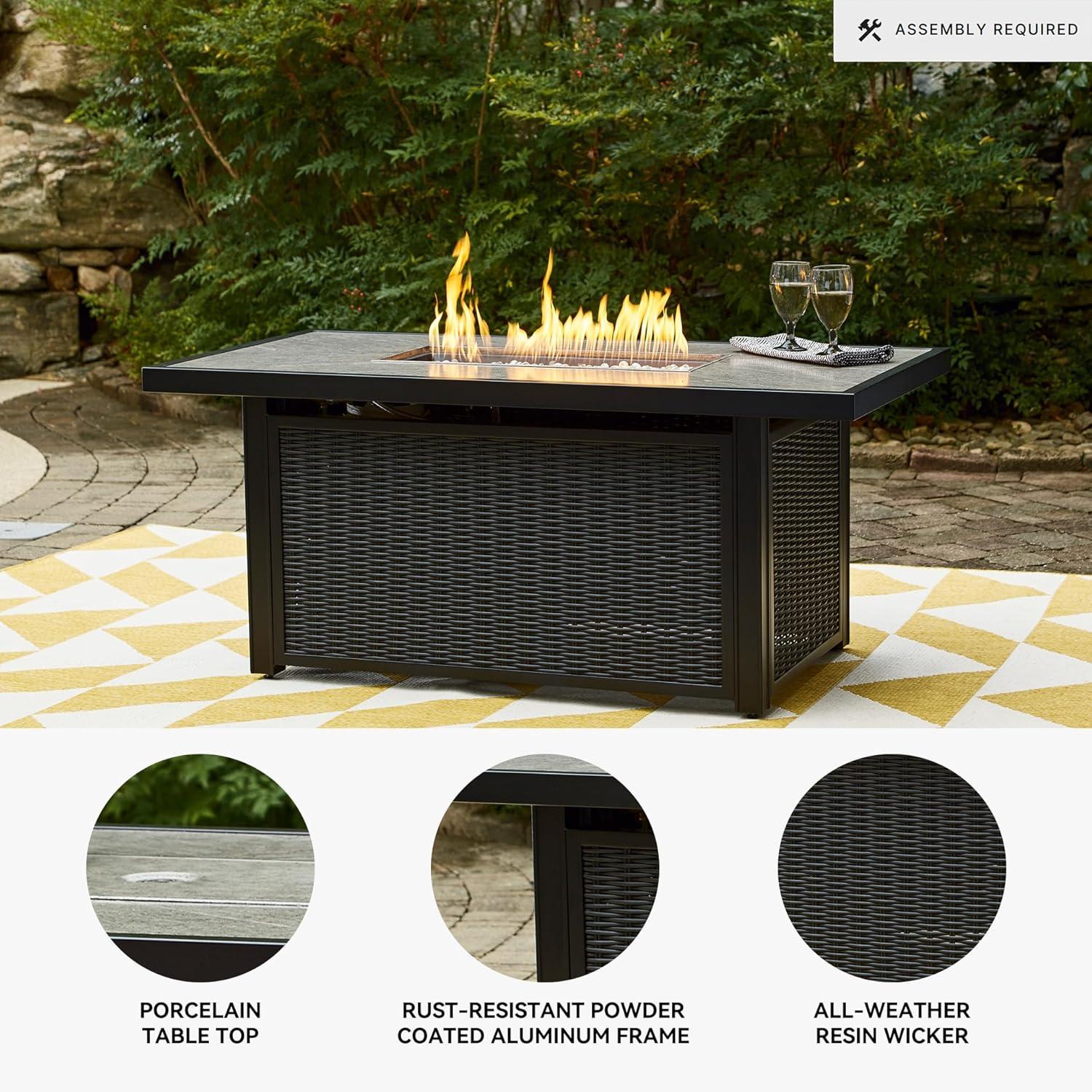 DURABLE DESIGN: Its hand-painted top is paired with all-weather resin wicker over rust-proof aluminum for beauty and brawn. A stainless steel burner with glass beads adds a captivating element