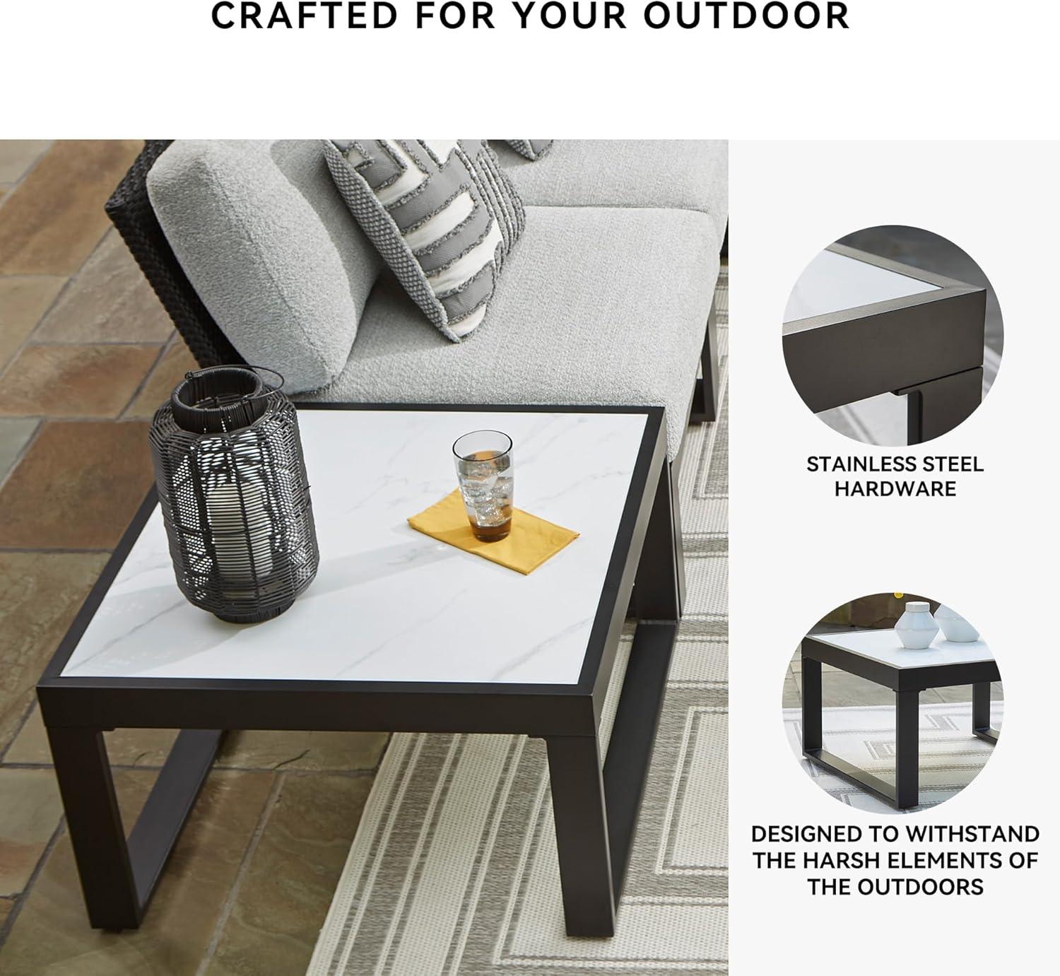 QUALITY MADE: Made with aluminum & resin wicker. Black finish. All-weather foam cushion core wrapped in soft polyester. Zippered cushions & pillows with solution-dyed high-performance Nuvella+, a cleanable fabric that offers enhanced UV resistance