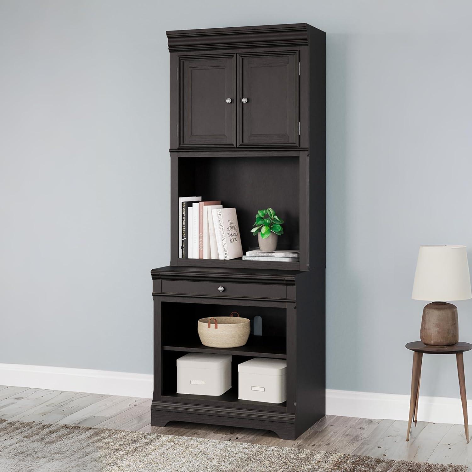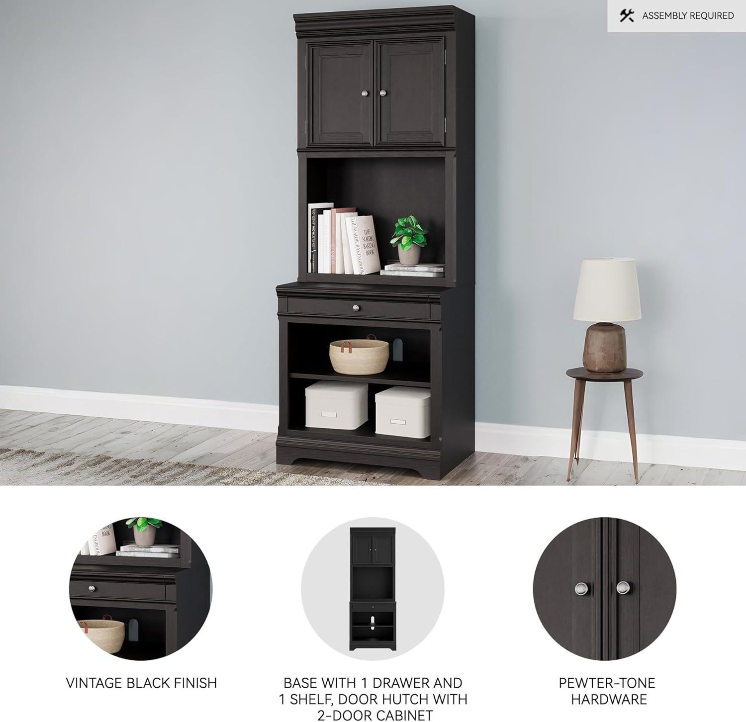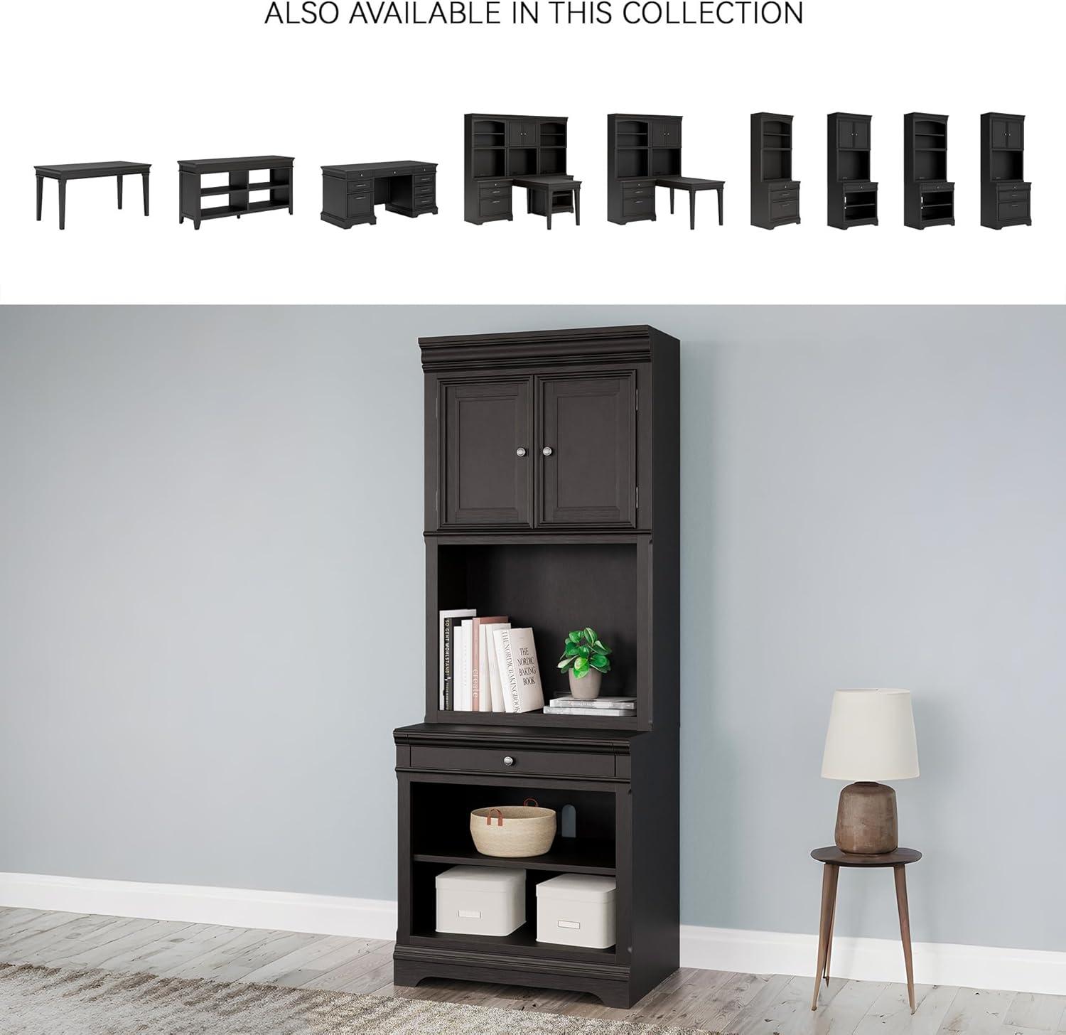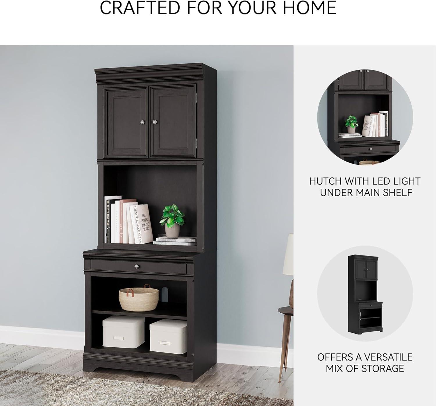 Make a style statement with this home office bookcase. Its traditional design is updated with an on-trend vintage black finish. A hutch with LED underlighting shines a light on those elusive reading glasses and other desktop items. The bookshelf, drawer and cabinet space add up to a well-organized work area.