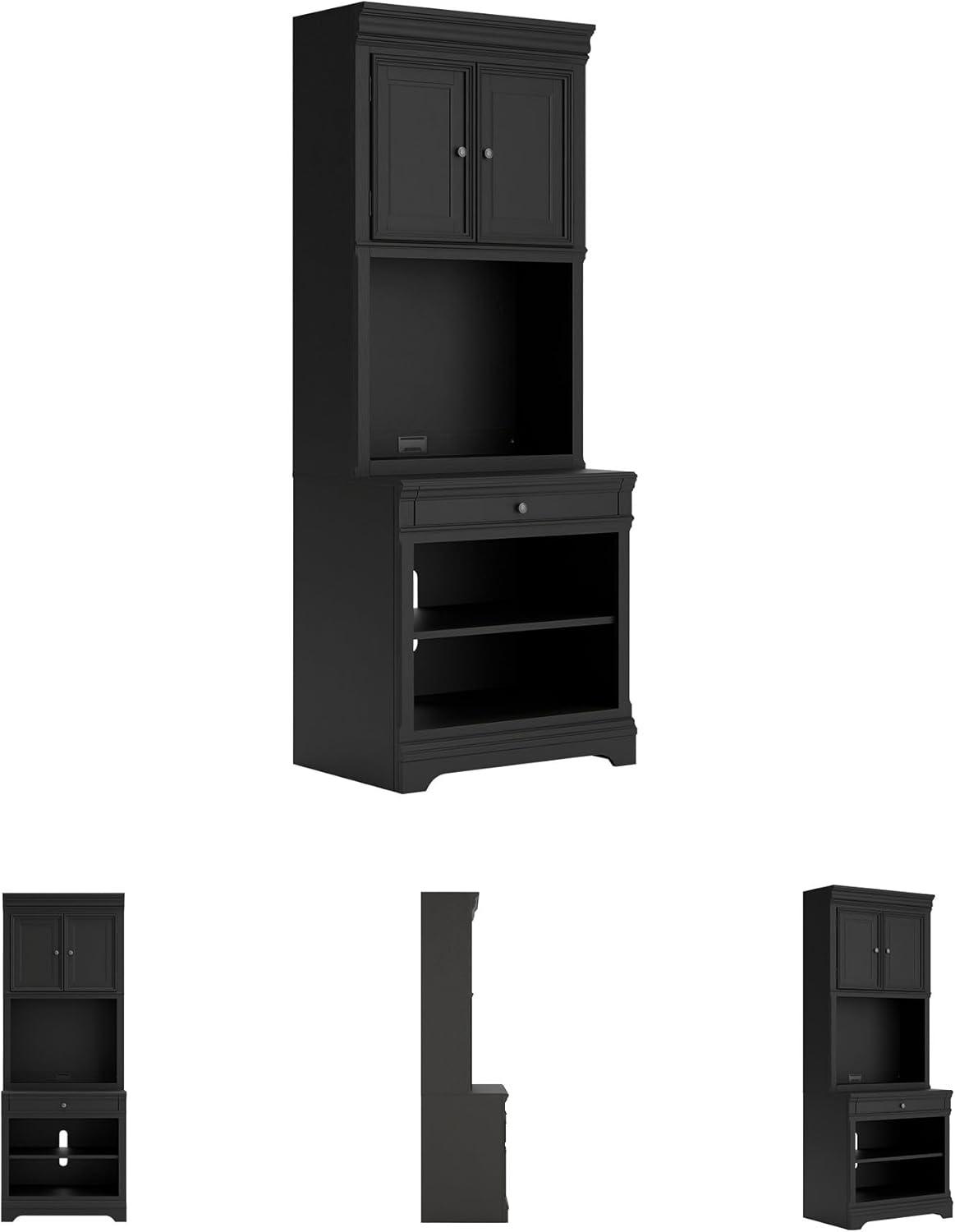 QUALITY CRAFTED: Made with solid wood frames, elm veneer & MDF substrate. Vintage black finish. Hardware with pewter-tone finish. Base with 1 drawer & shelf. Hutch with 2-door cabinet. Hutch has LED light under shelf. Power cord included; UL Listed