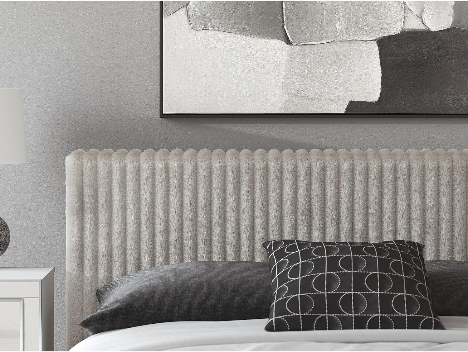 KING UPHOLSTERED PANEL STORAGE BED: If glitz and glam are your jam, you'll love this bed. Gleaming glitter and chrome-tone touches pair with tufted gray faux fur for stunning pizzazz. Spacious drawers with large, faceted handles don't disappoint
