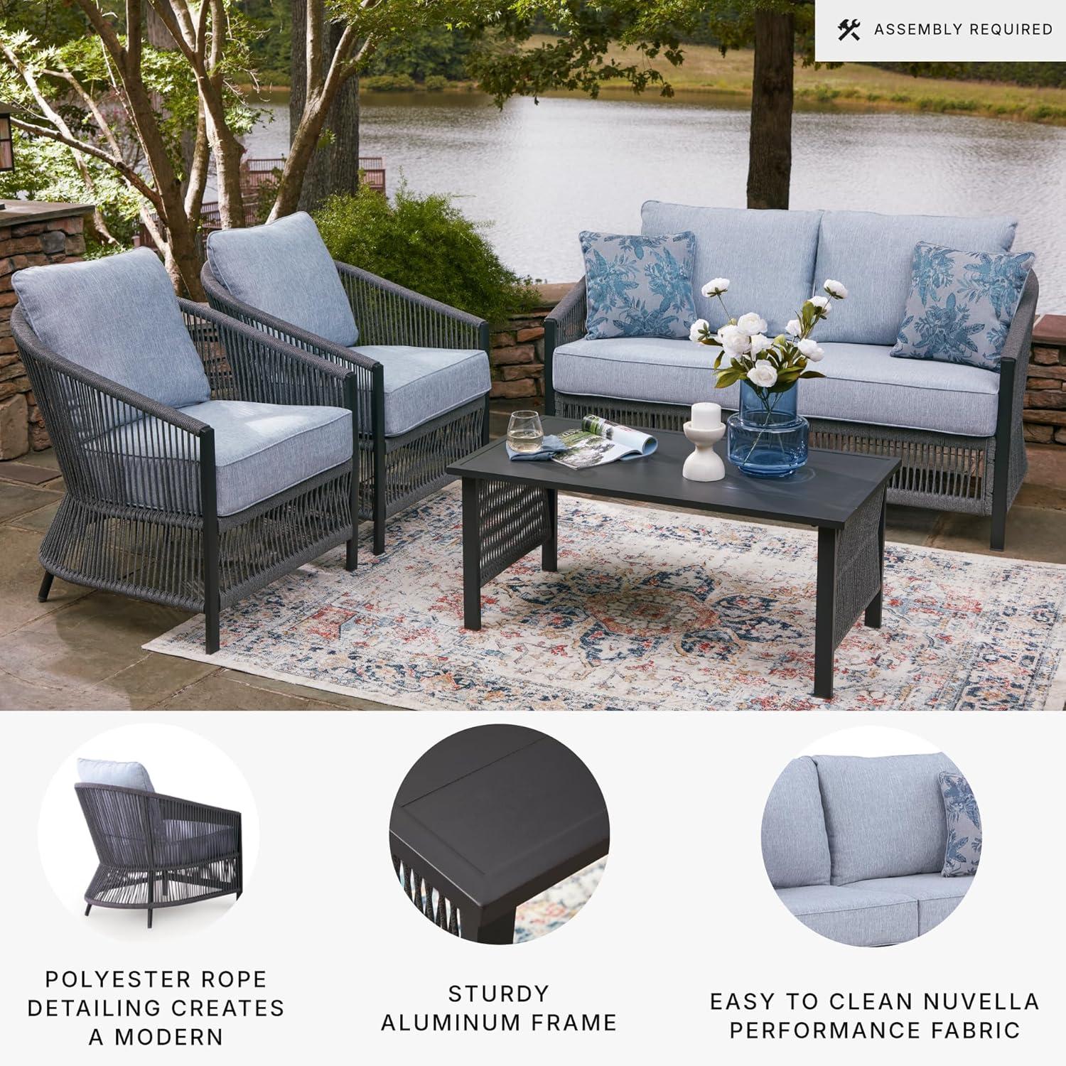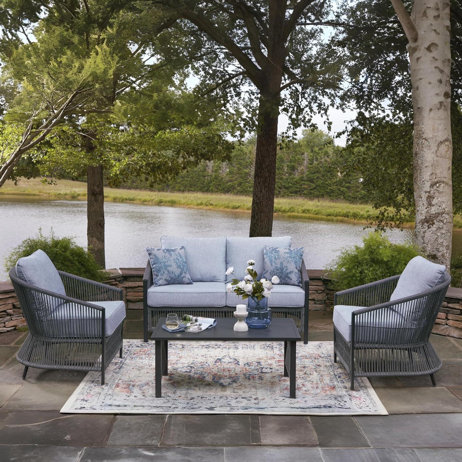 OUTDOOR LOVESEAT, CHAIRS & TABLE SET: Bring indoor comfort outside with this 4-piece set featuring a light rope design, plush UV-resistant cushions & a sturdy table for drinks & snacks. Perfect for cozy patio vibes and laid-back lounging