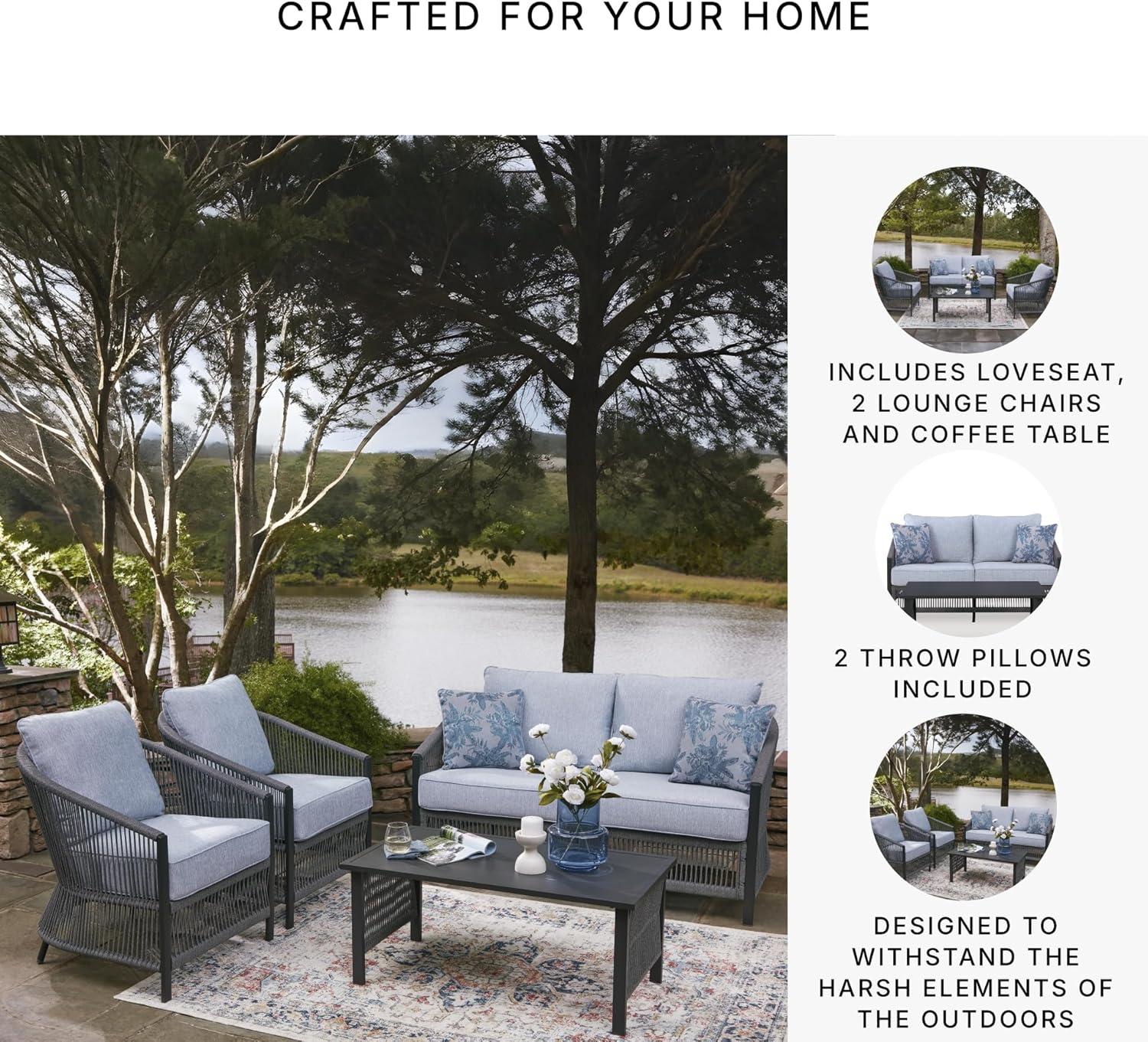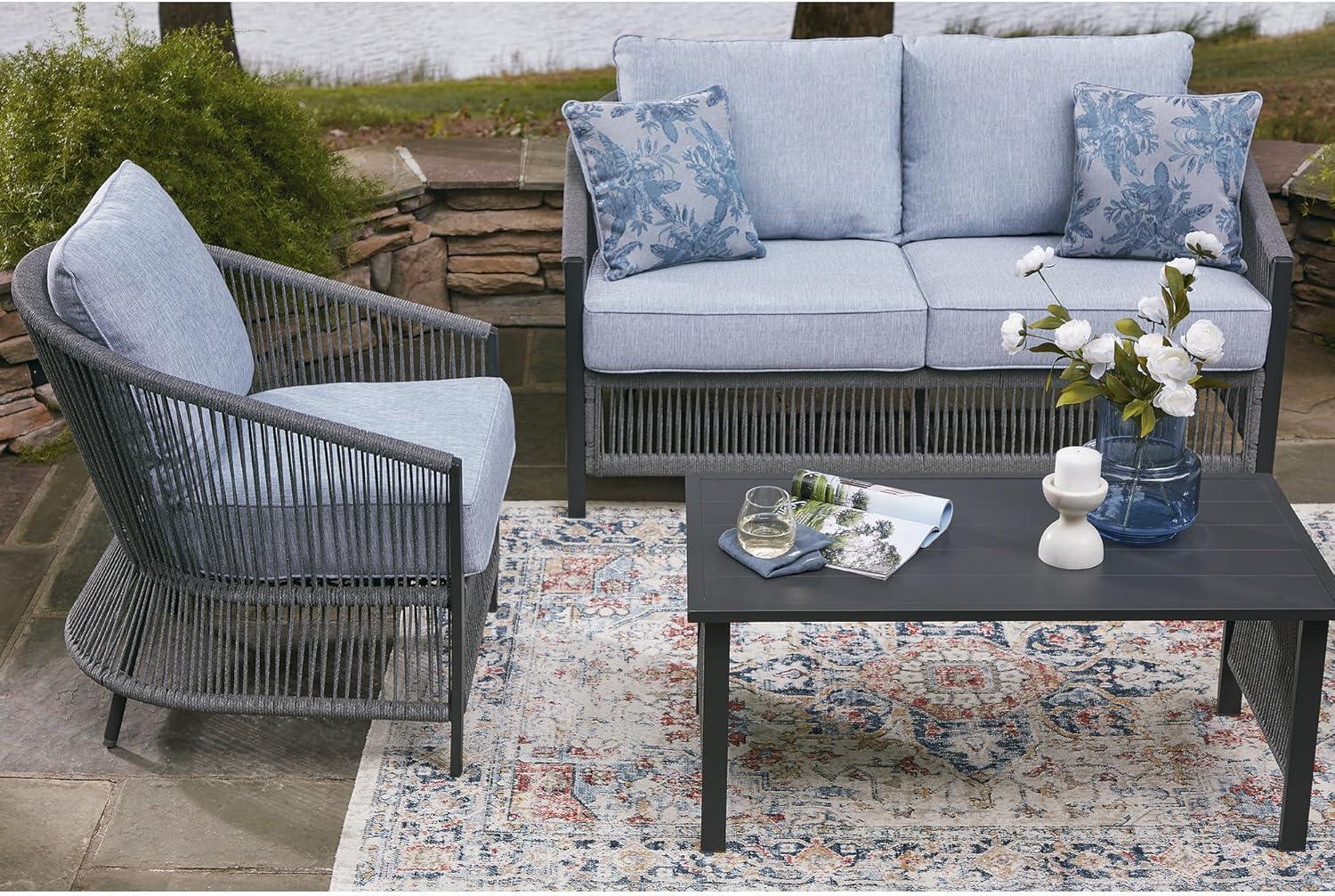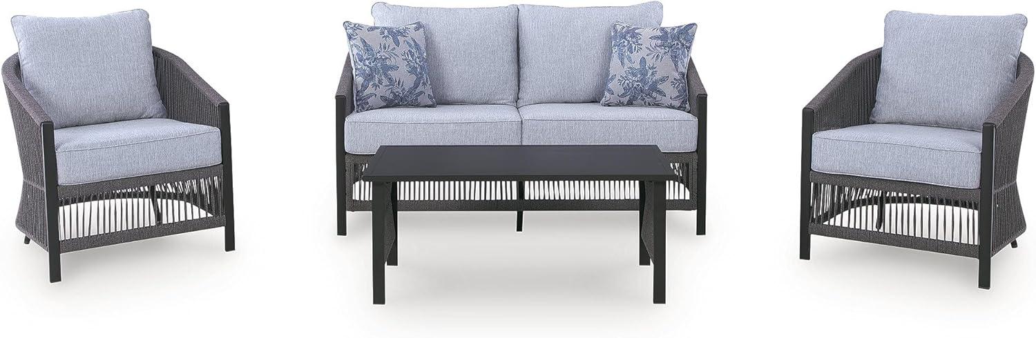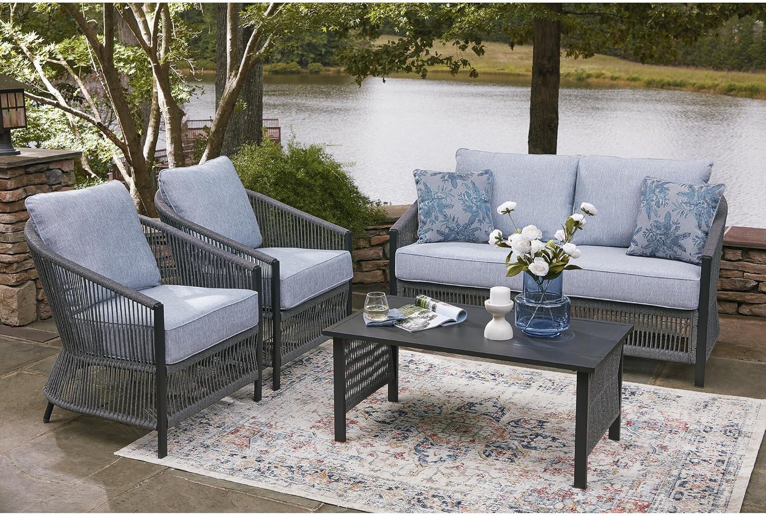 Signature Design by Ashley Bodega Island Contemporary Weather Resistant Outdoor Loveseat/Chairs/Table Set with 2 Accent Pillows, Set of 4, Light Gray