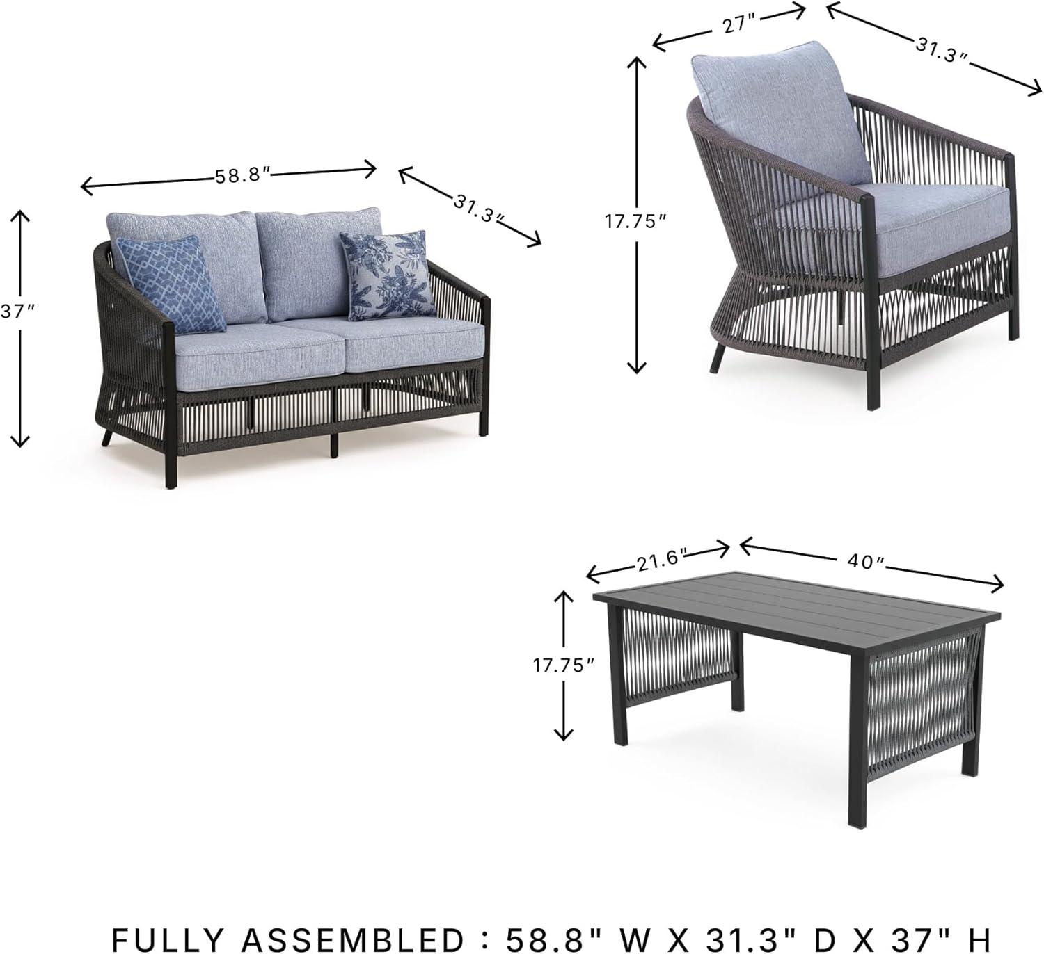 DIMENSIONS: Measures 58.8″ W x 31.3″ D x 37″ H. Includes loveseat, 2 lounge chairs and coffee table