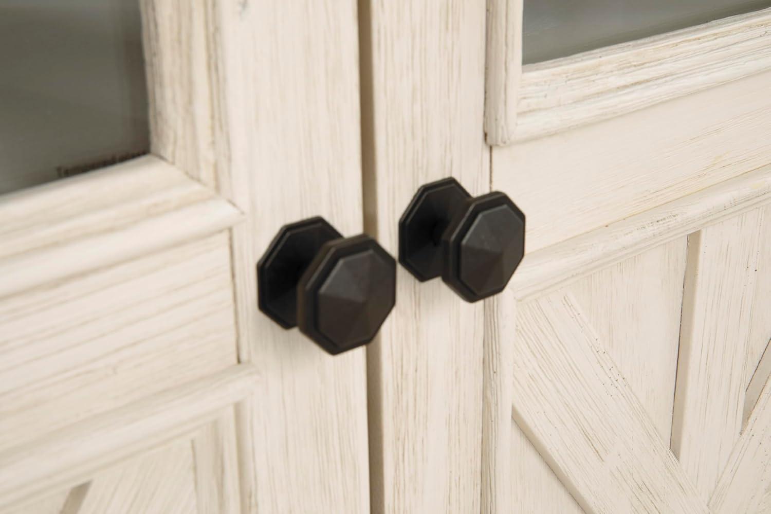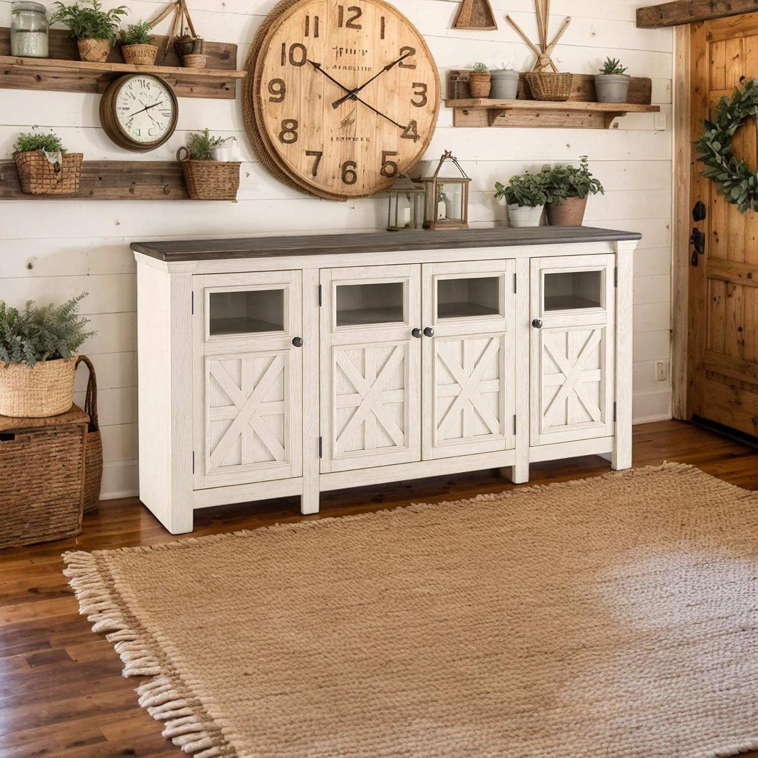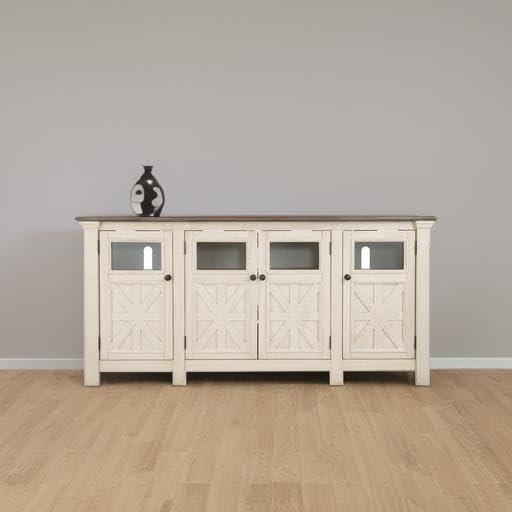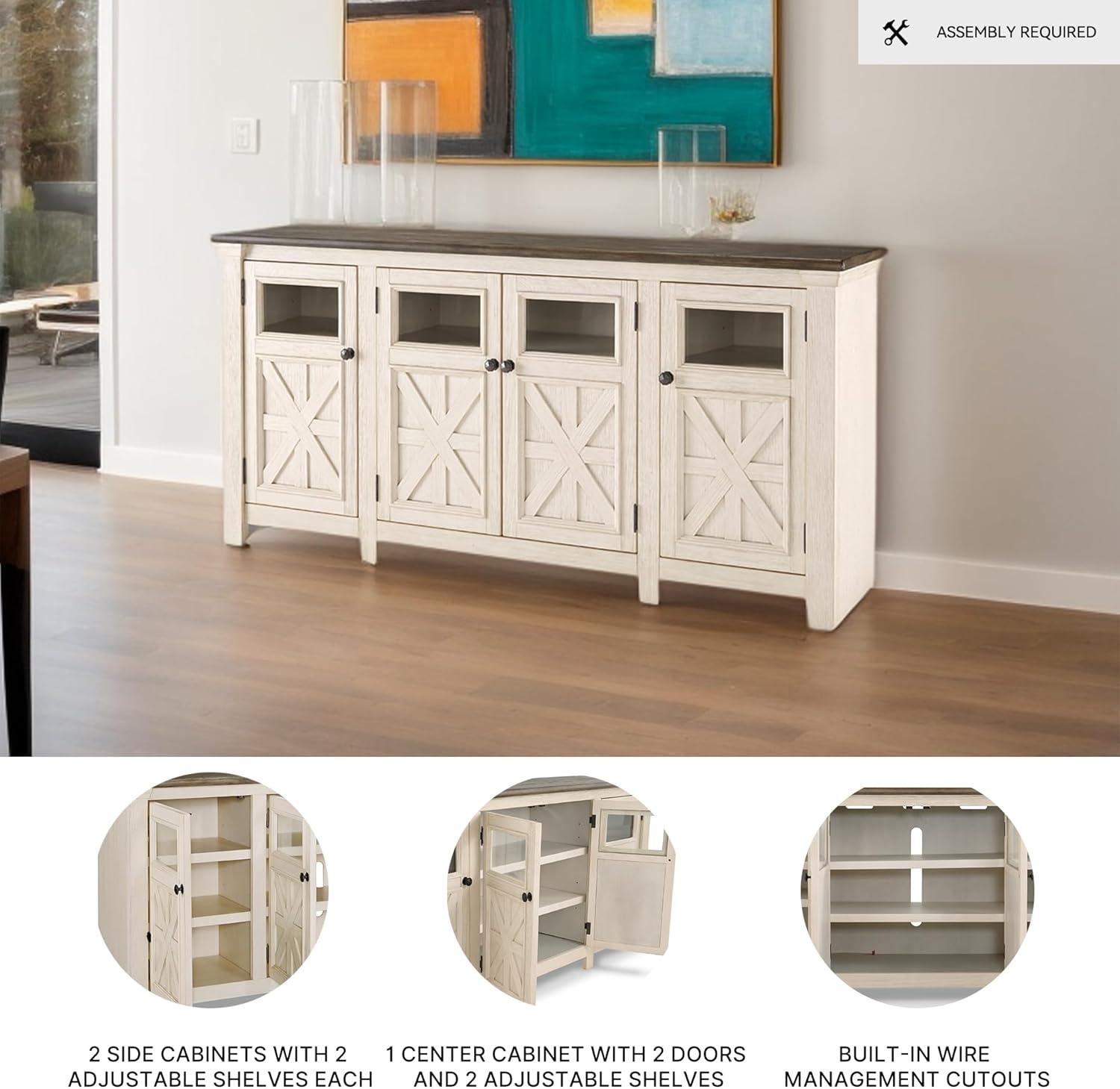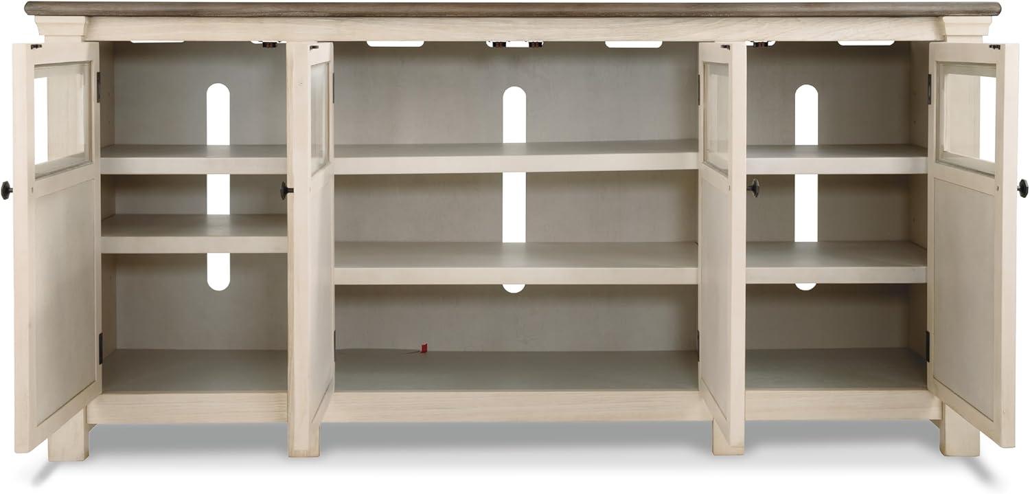 Whether your style is farmhouse fresh, shabby chic or country cottage, you’ll find this large TV stand perfectly in tune. Its two-tone finish pairs a trendy textured antique white with a weathered gray for that much more quaint character. Charming elements include crossbuck adorned cabinet doors with glass inlays for peek-through flair. Ample adjustable shelving and cutouts for wire management nicely accommodate your media needs. A stylish TV stand can make your entertaining space a cozy place to relax and recharge. Our entertainment centers provide sturdy support for TVs and other electronics while hiding the wires and cords that could clutter your decor. Whether you're looking for mid-century, farmhouse or other styles, our furnishings include display and storage space, with open and closed-door compartments, drawers and adjustable shelving.