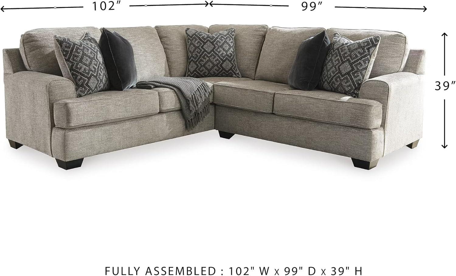 DIMENSIONS: Measures 102″ W x 99″ D x 39″ H. Includes 2 pieces: right-arm facing sofa with corner wedge and left-arm facing loveseat. “Left-arm” and “right-arm” describe the position of the arm when you face the piece