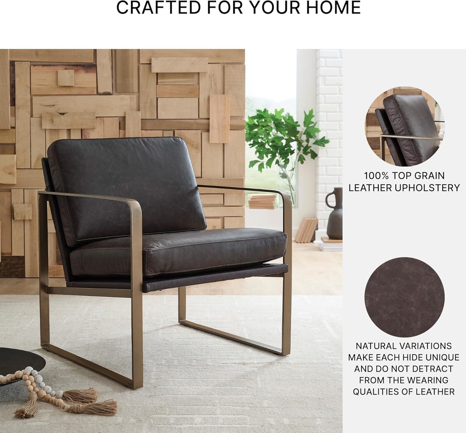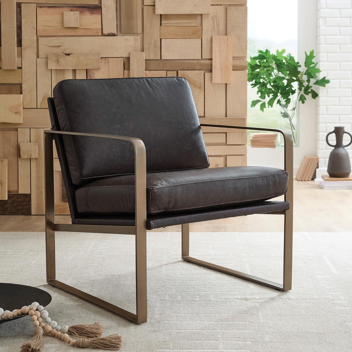 CONTEMPORARY ACCENT CHAIR: Wowing with supple dark brown leather and a metal frame in a soft goldtone, this accent chair brings modern sophistication to your space. An ultra-cool base gives so much urban industrial appeal