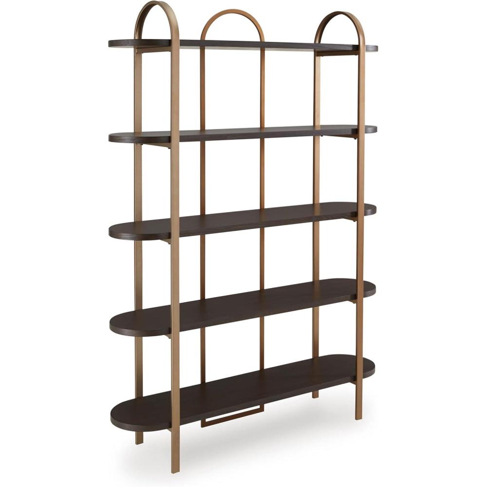 5-SHELF BOOKCASE: With its mixed-material look, this bookshelf fits into a wide range of modern settings. Its dark brown display shelves are balanced by sleek antiqued goldtone metal supports