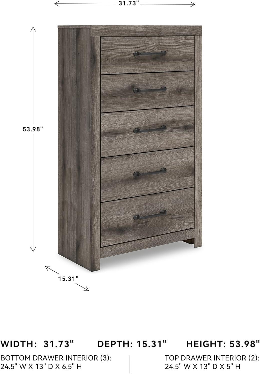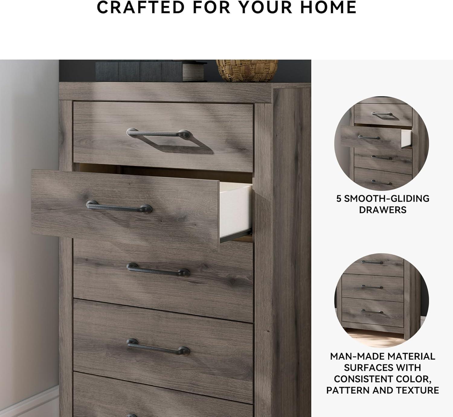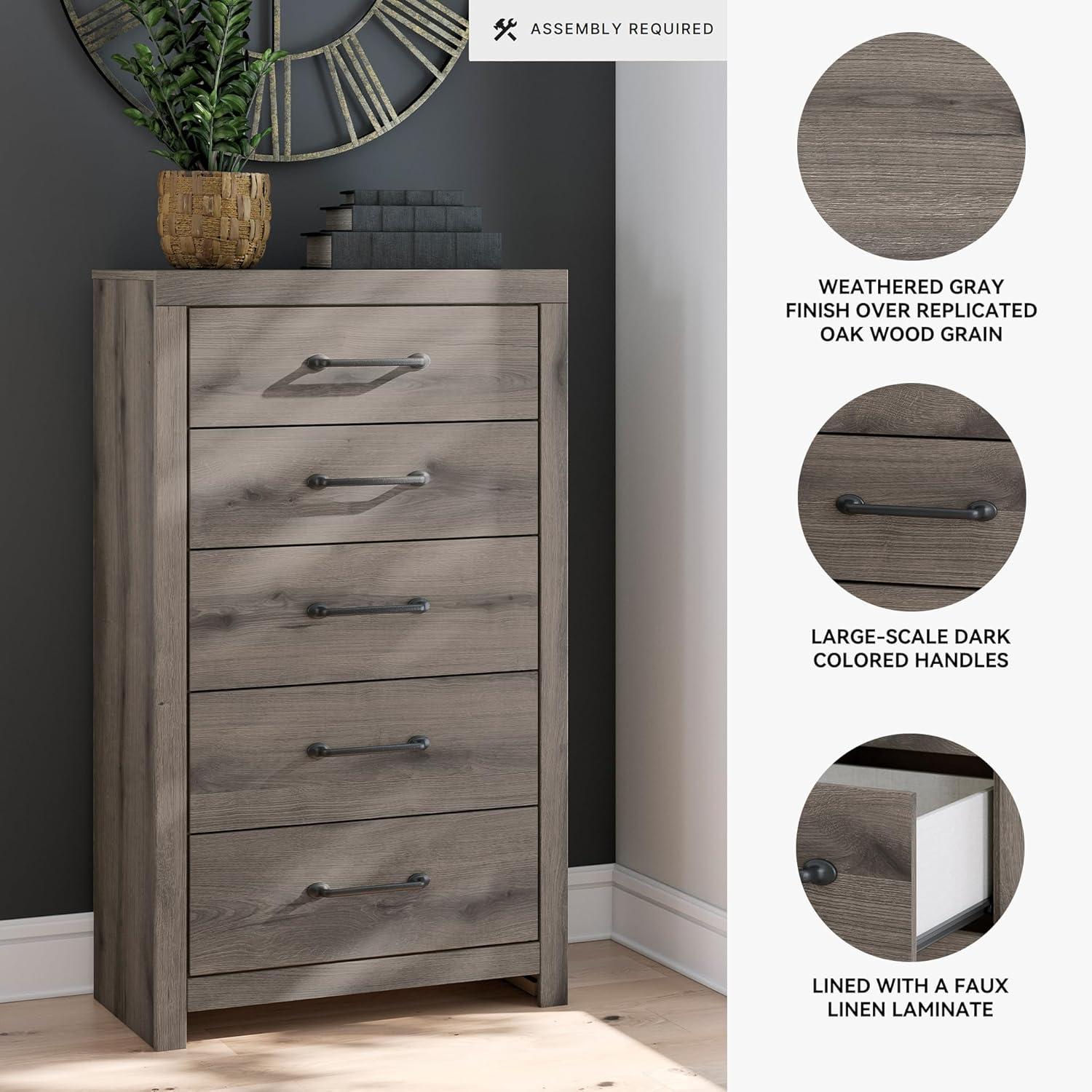 QUALITY CRAFTED: Made with engineered wood & decorative laminate with dark charcoal finish over replicated oak grain. 7 smooth-gliding drawers; 3 sizes. Linear pulls with dark pewter-tone finish. Mirror attaches to back of dresser