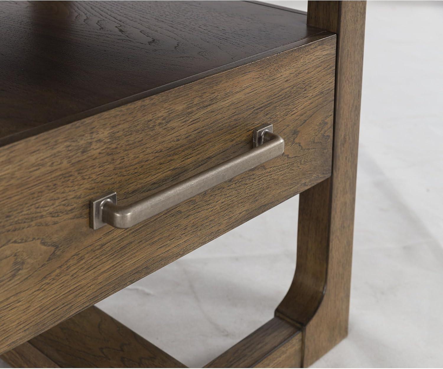 This end table sits comfortably at the intersection of modern lodge and farmhouse aesthetics. Your warm and welcoming disposition is reflected in the charming architectural elements and light brown glazed finish. Even with its poise, this table remains practical. A drawer and unique open shelf design encourage you to store and display in style.