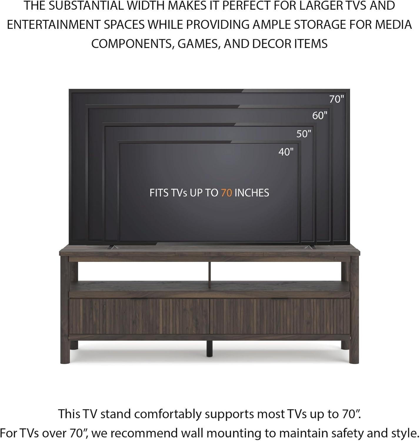 Crafted with both form and function in mind, this TV stand brings a dash of retro-cool character to your modern boho aesthetic. A reeded design on its drawers adds an on-trend touch to storing entertainment essentials. Warmly welcoming with a rich brown finish, the TV stand pairs well with muted hues, earth tones and other neutrals alike. And for added ambiance, lighting under the top brings a cool vibe to your favorite shows or video gaming. What a refined take on easygoing style.