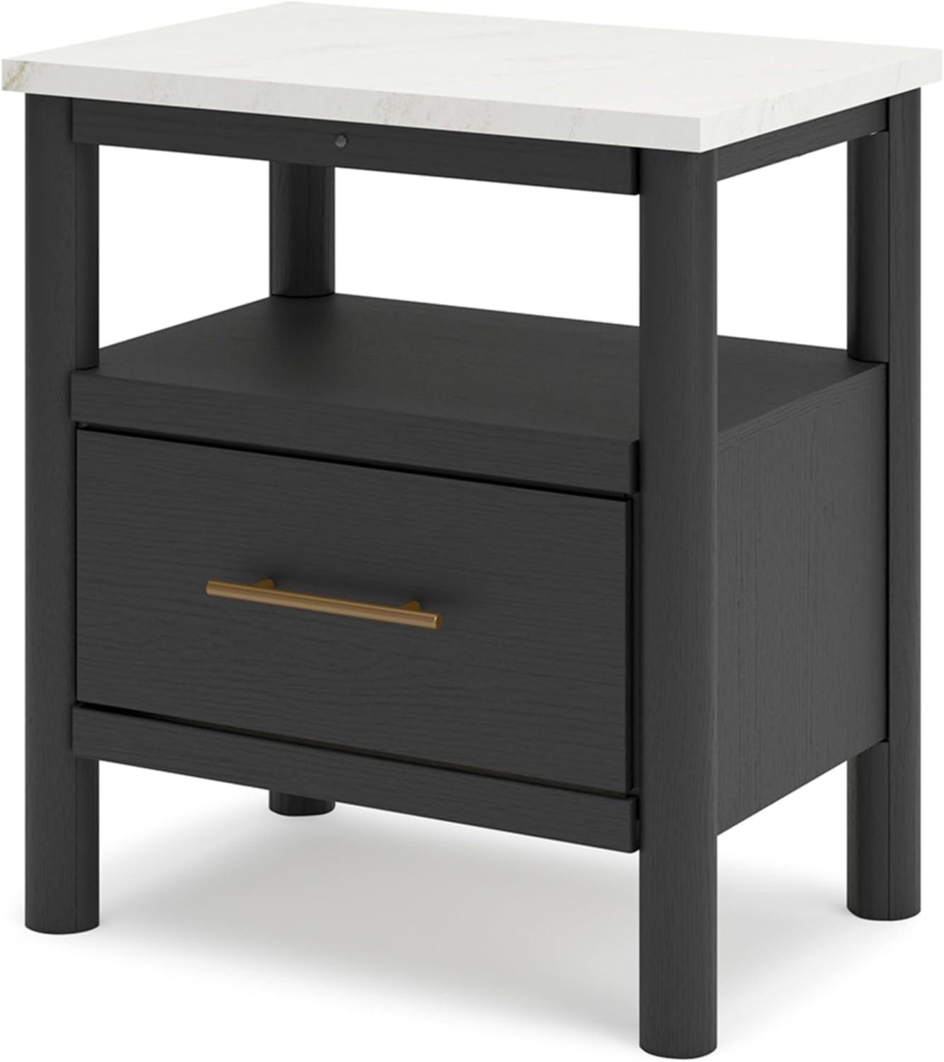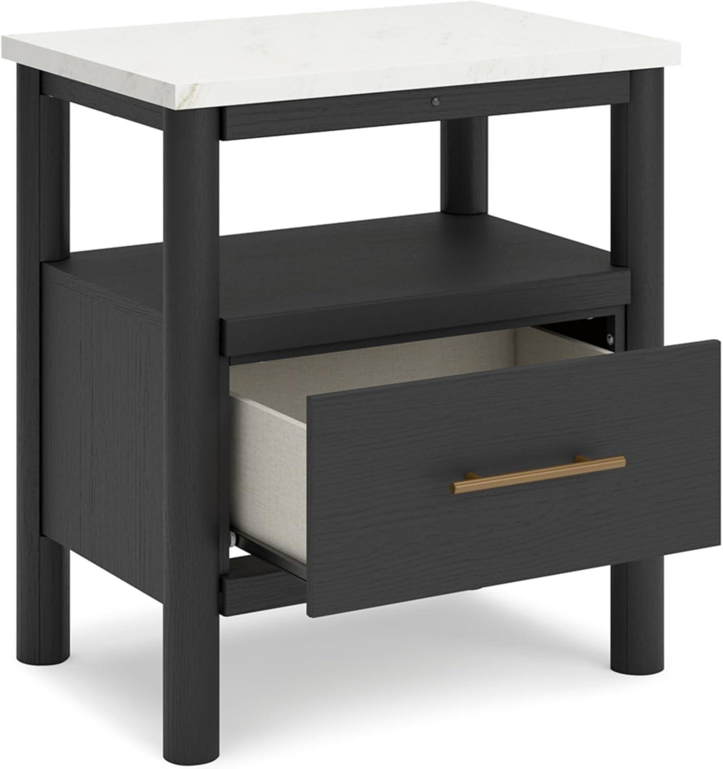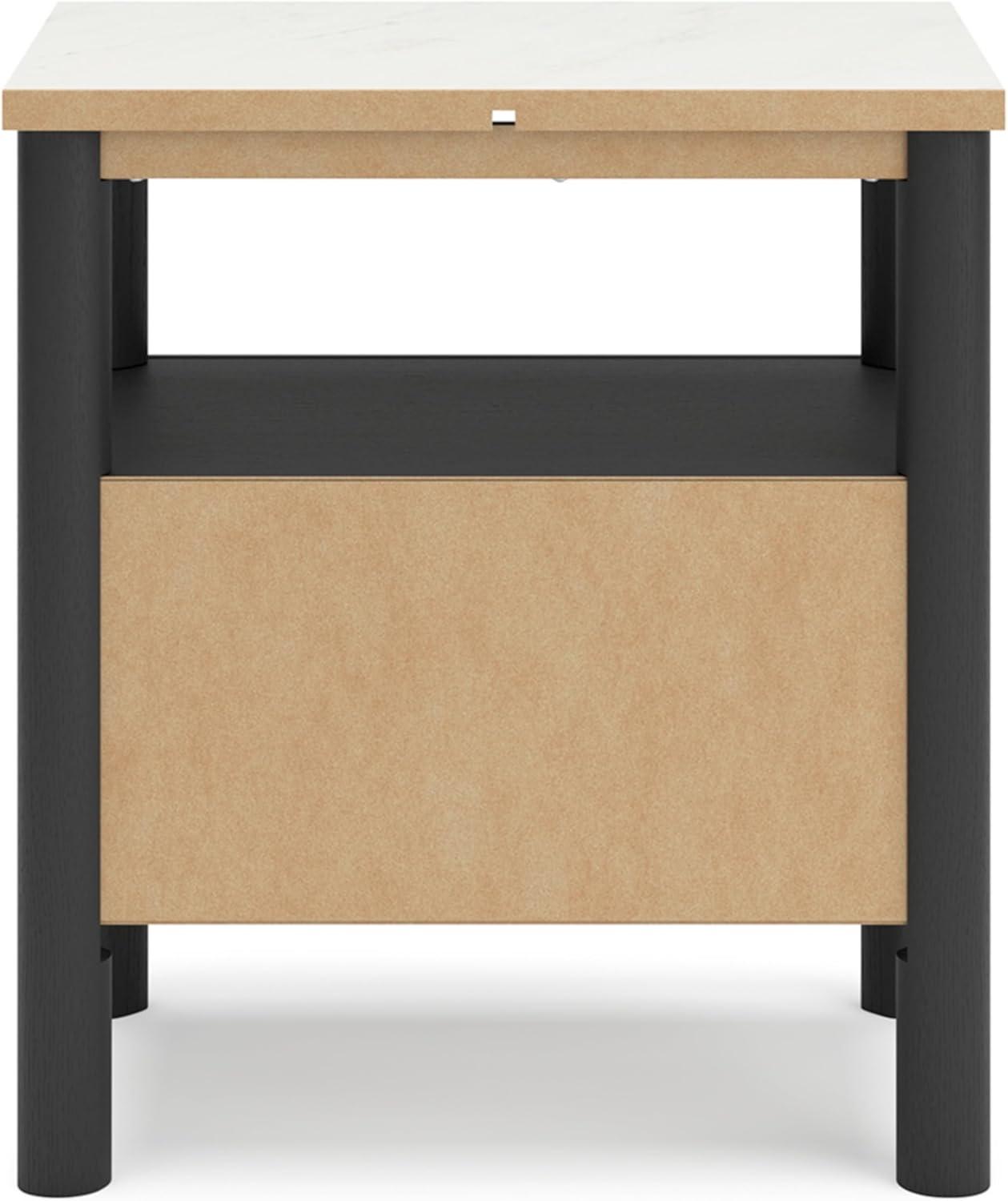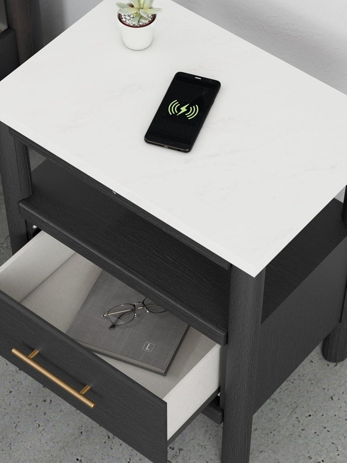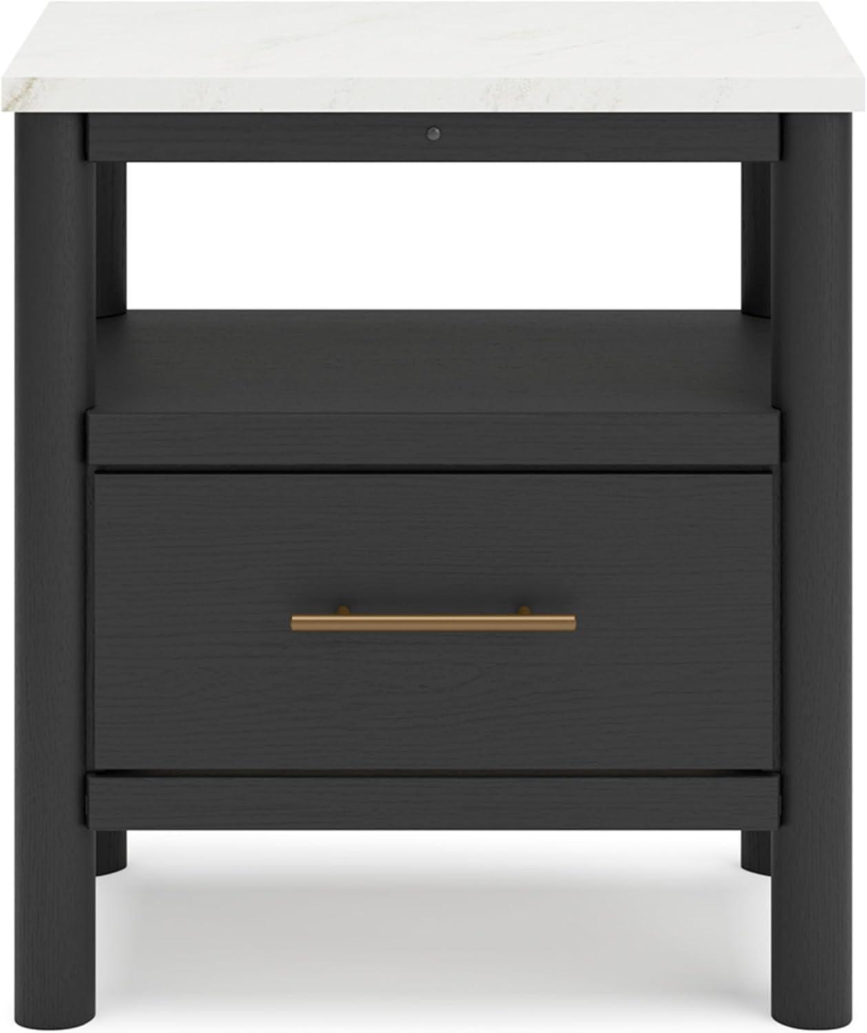 Signature Design by Ashley Cadmori Casual Faux Marble Tabletop 1 Drawer Nightstand with Open Shelf, Ambient Lights, Wireless Charging and USB-C Ports, 26.57″ Tall, Light Brown & White(Black & White)