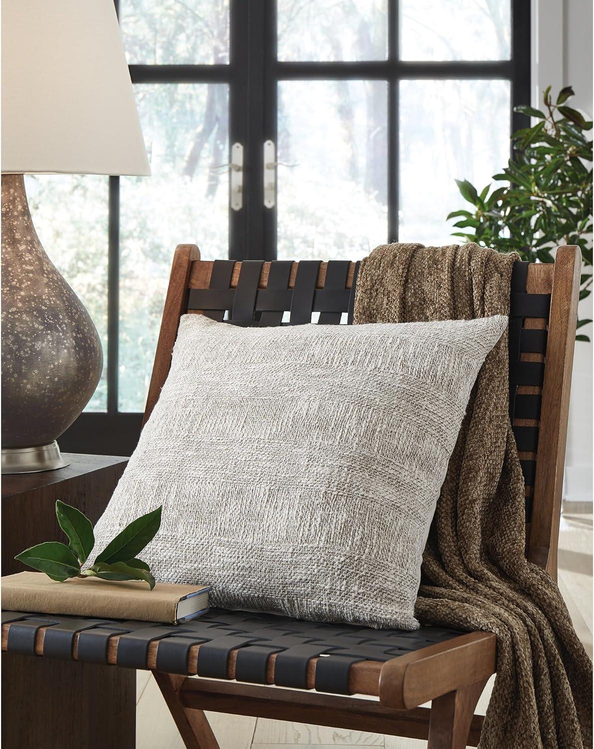 With the inviting design of this ivory-hued throw pillow, you can take your space from drab to fab. Its wonderfully woven texture creates a piece with a classically chic flair, adding depth and dimension to your seating area. Signature Design by Ashley is a registered trademark of Ashley Furniture Industries, Inc.