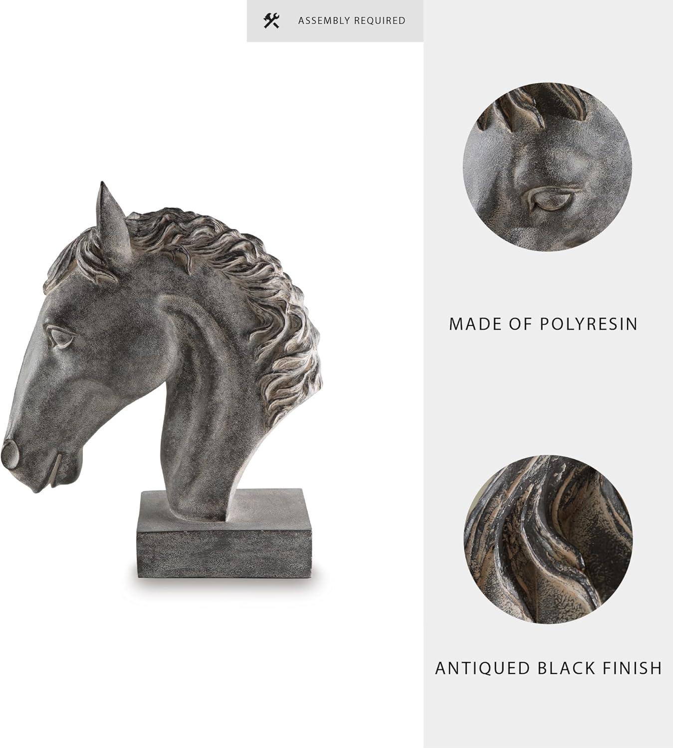 TRADITIONAL SCULPTURE: An exquisite work of art, this horse head sculpture graces your space with traditional flair. Its antiqued black finish is rich with depth and character. What a striking mane attraction for a bookcase, desk or entryway table
