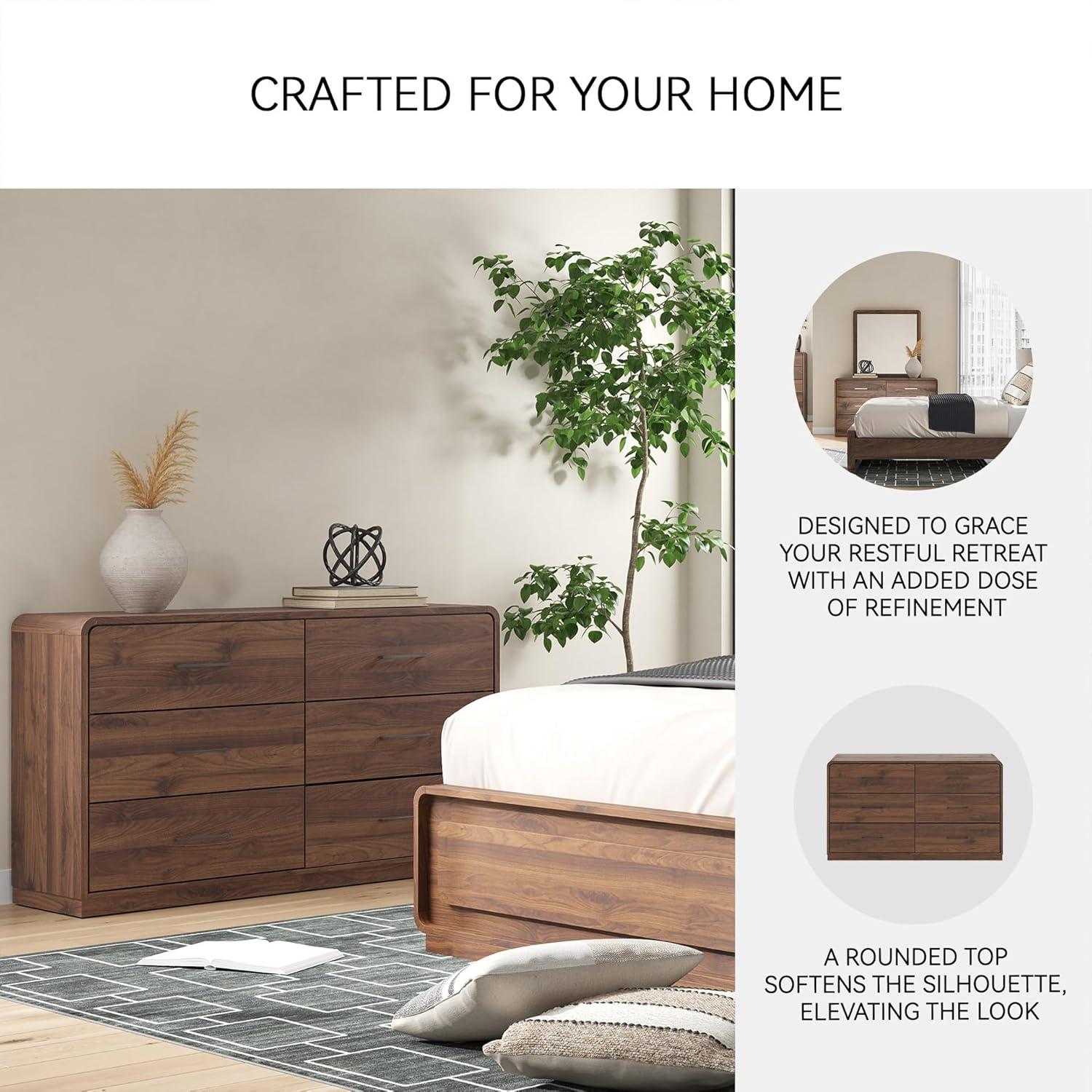 CONTEMPORARY DRESSER: Add refinement to your restful retreat with this dresser. A stunning rich brown wood tone and sleek drawer pulls add luxury. A rounded top softens the silhouette. It’s curated, contemporary and utterly chic