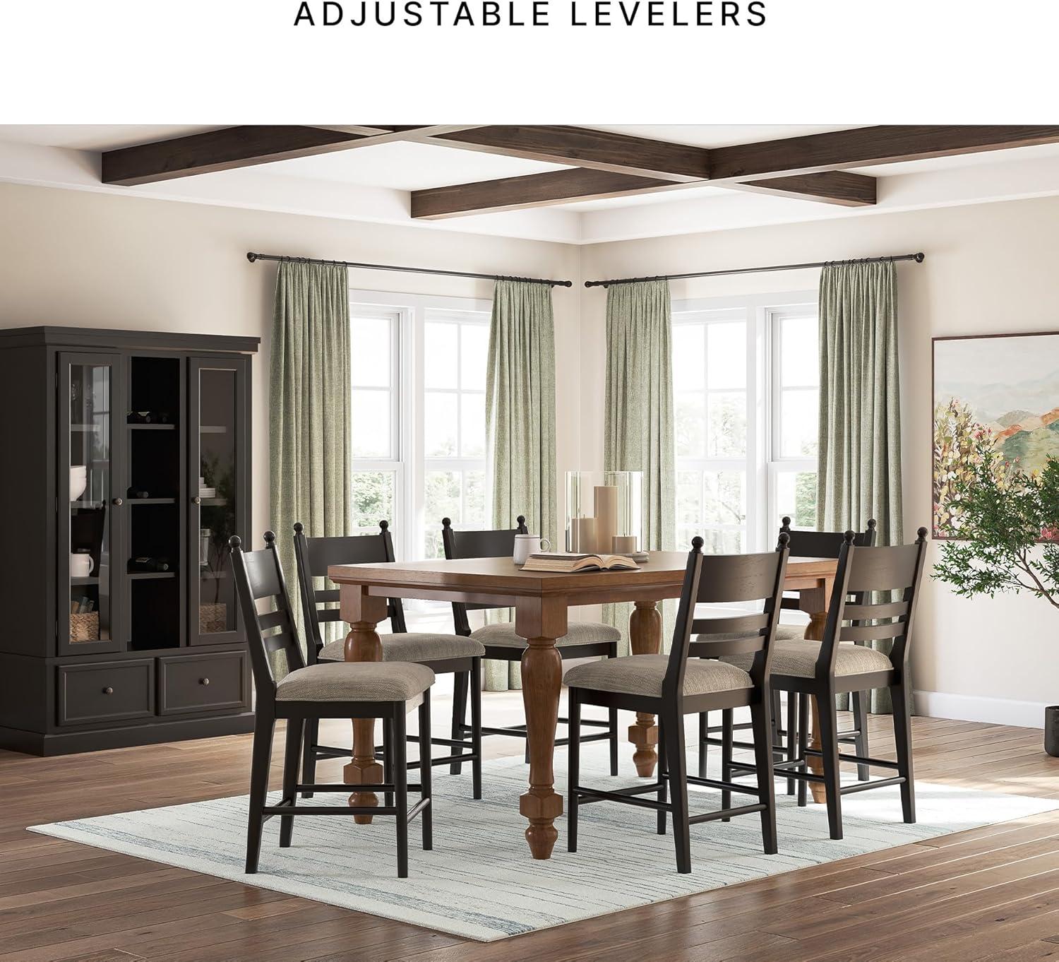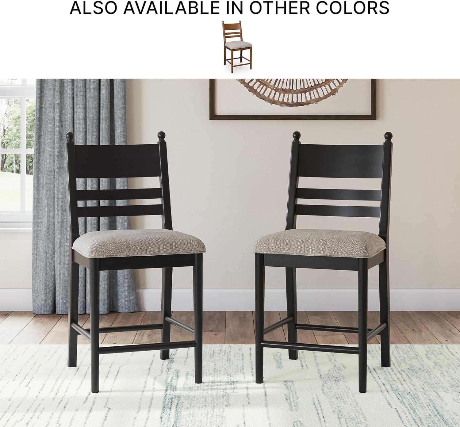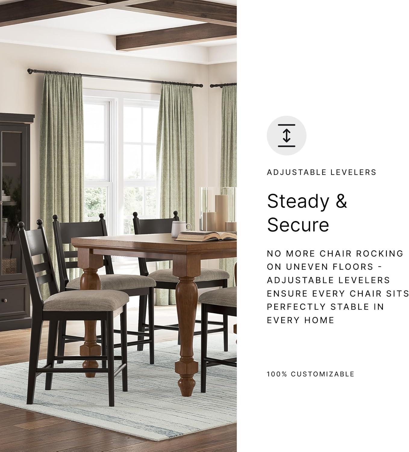 The Chadworth counter height farmhouse bar stool embodies relaxed country style with cozy comfort, perfect for kitchen islands or casual dining areas where family gathers. The solid wood frame in a warm brown finish brings rustic simplicity that pairs seamlessly with shiplap accents, open shelving or mixed seating for an eclectic vibe around your space. A foam-cushioned polyester-upholstered seat provides plush support for lingering over meals, coffee chats or homework sessions, encouraging guests to settle in comfortably. Adjustable levelers ensure stability on uneven floors, helping the stool stay steady during everyday use without wobbling. As a farmhouse barstool, it celebrates classic ladderback design with practical details, making it easy to mix and match for a personalized, lived-in look that enhances casual entertaining.