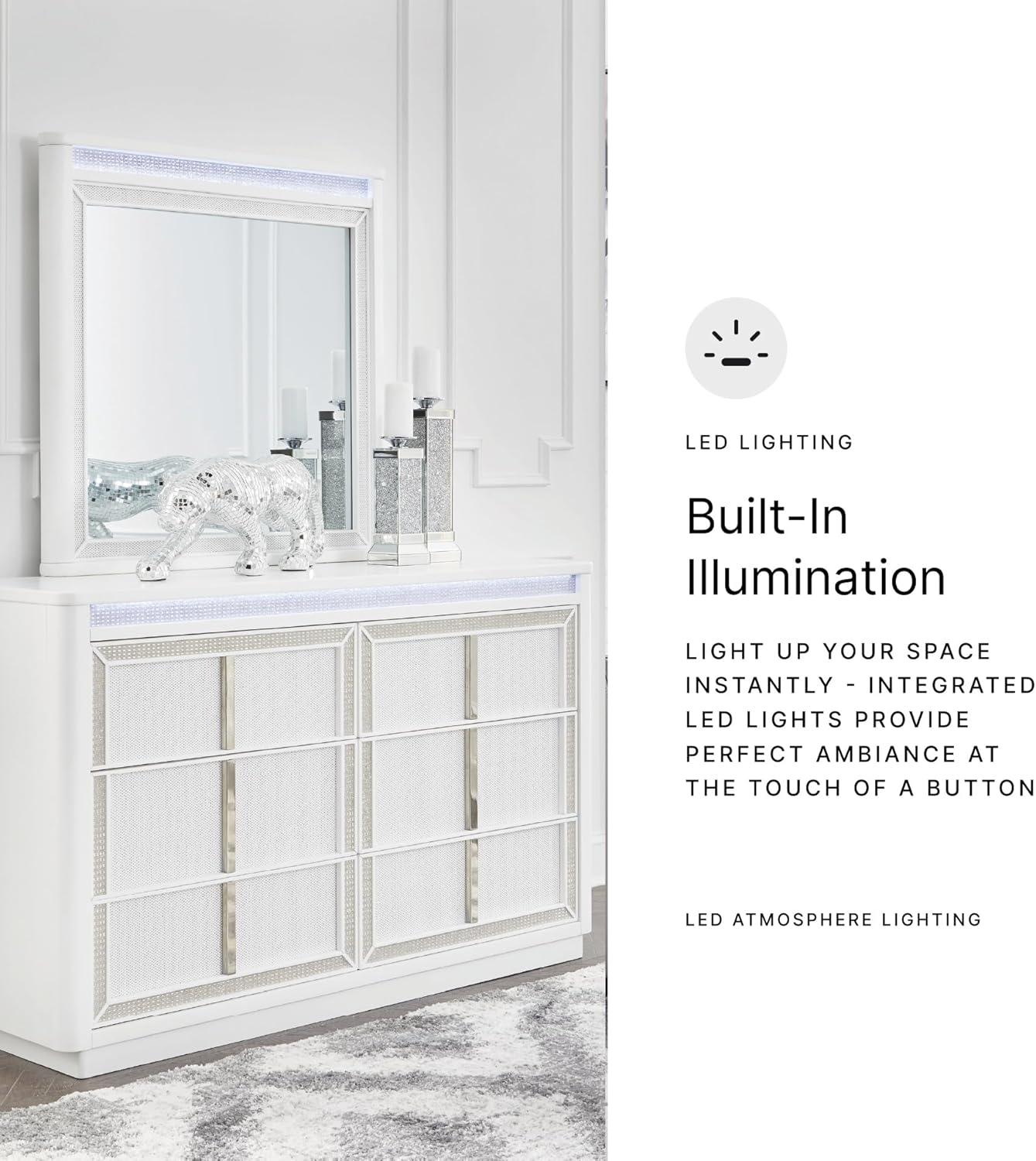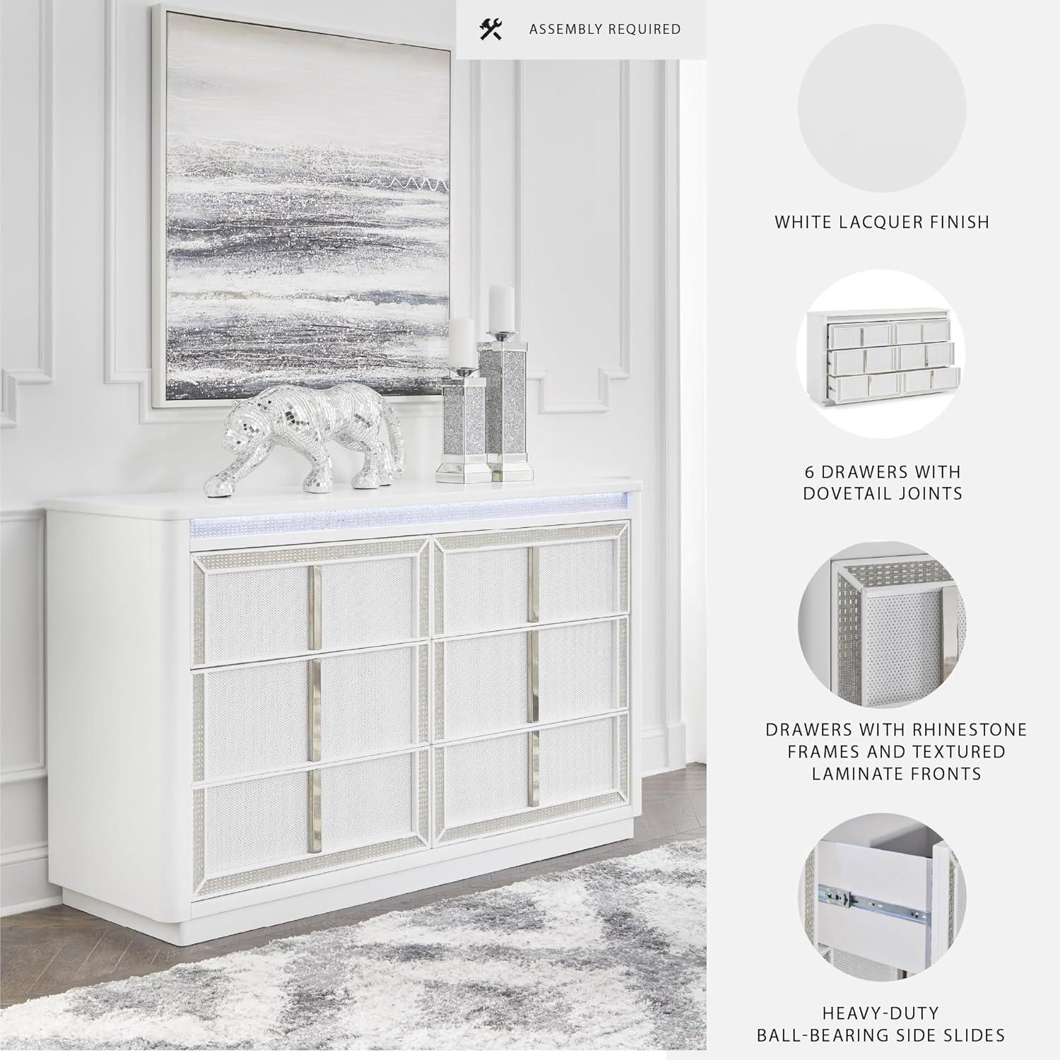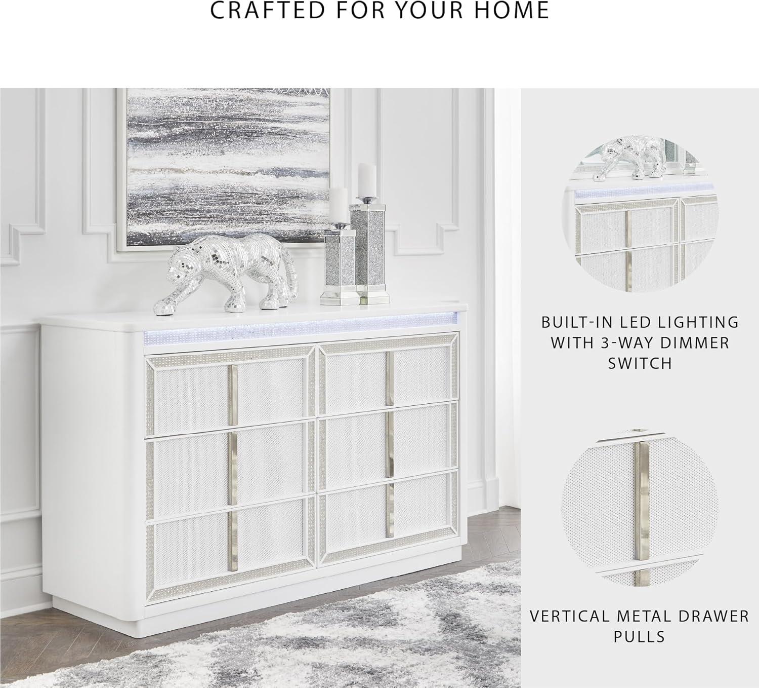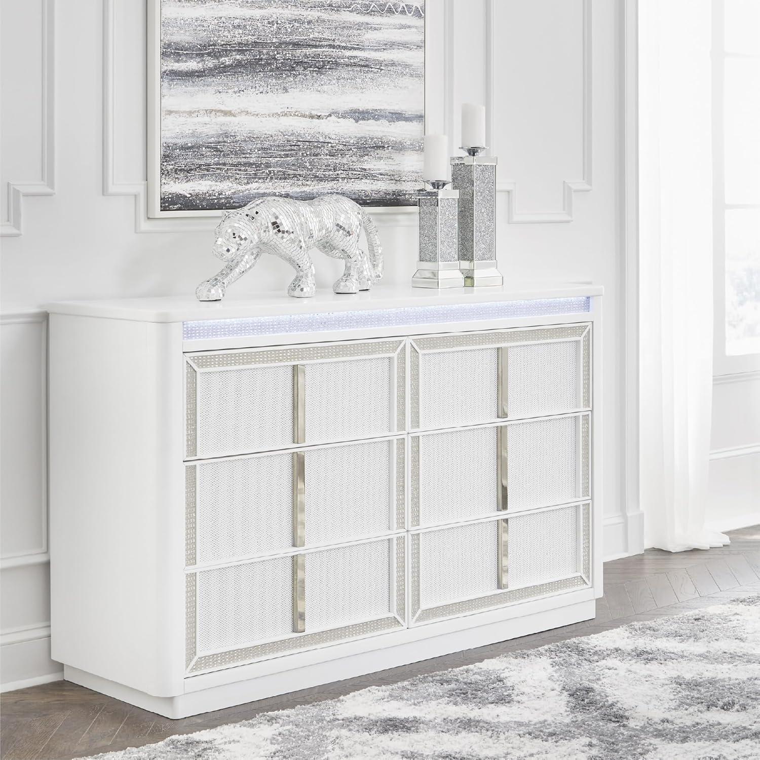 Signature Design by Ashley Chalanna Contemporary 6-Drawer Dresser with LED Lighting, Felt-Lined Top Drawer and Safety Stop, White
