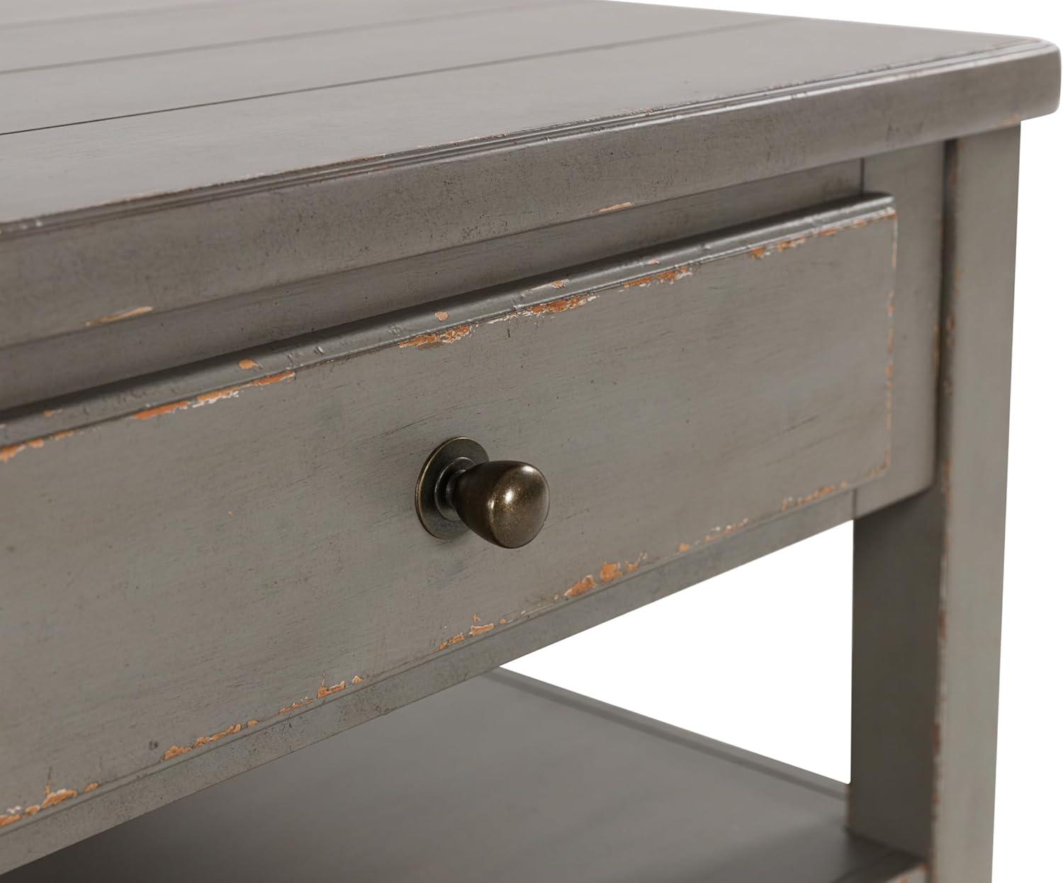 Put your love of European farmhouse styling on display. Finished with an antiqued gray chipped paint effect for an authentic vintage look, this coffee table is loaded with character. Two drawers and an open display shelf allow for storage and easy access to books, beverages and more.