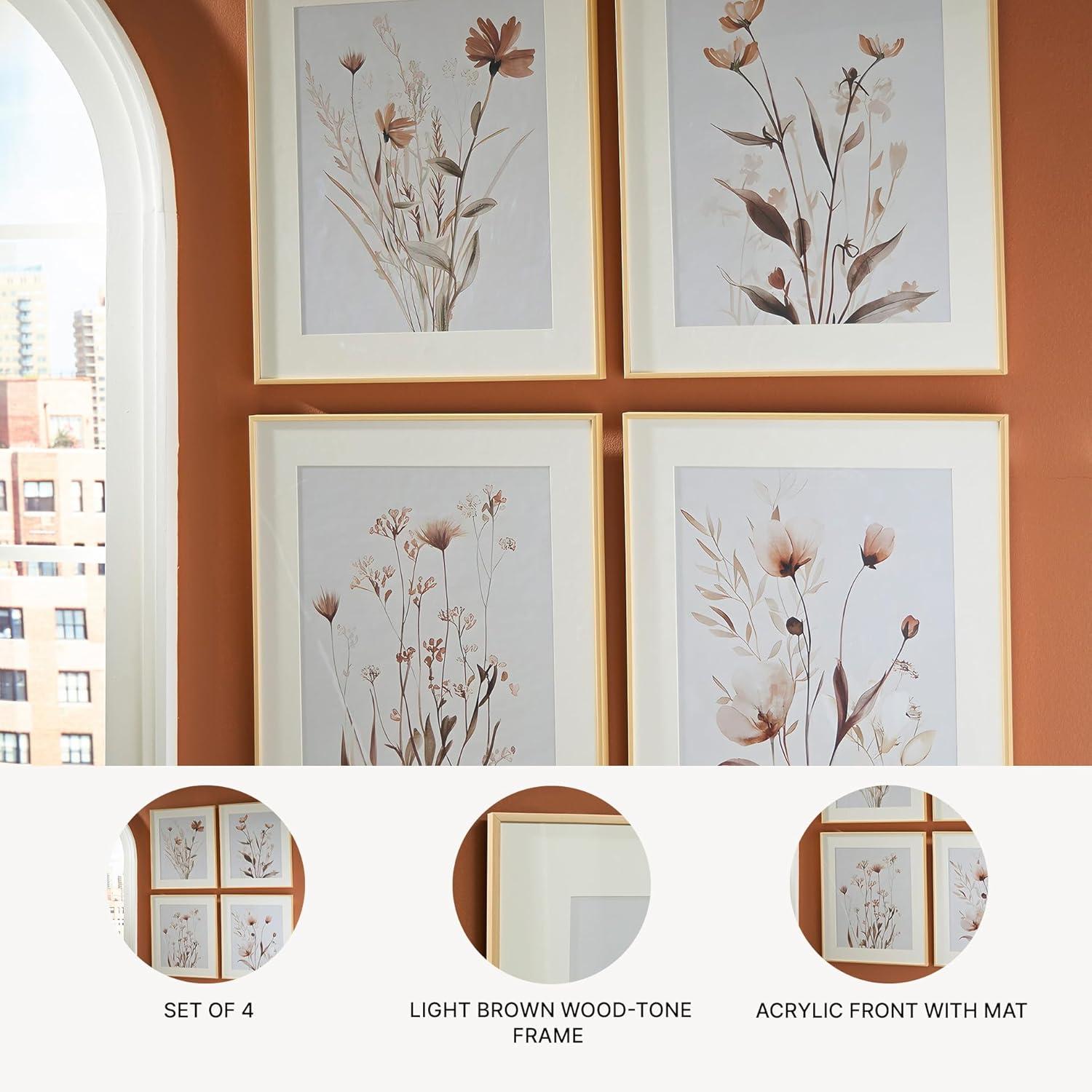 INSTANT STYLE: Set of 4. Framed print. Light brown wood-tone frame. Acrylic front with mat. D-ring bracket for hanging; vertical hanging only