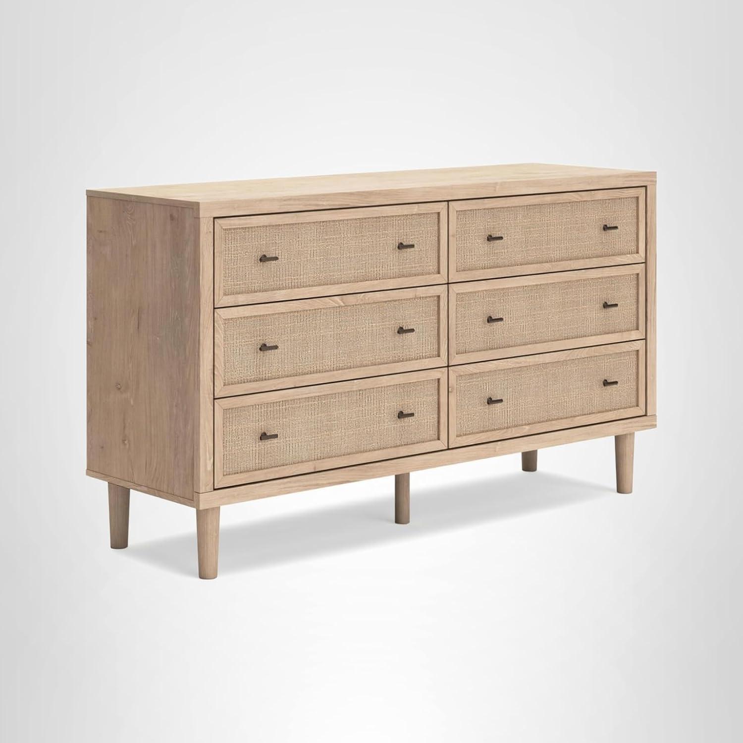 QUALITY CRAFTED: Made with engineered wood & decorative laminate. Dry, light finish & replicated oak grain. Framed drawer fronts with replicated beige cane finish. Bronze-tone knobs. Includes 6 smooth-gliding drawers lined with faux linen laminate