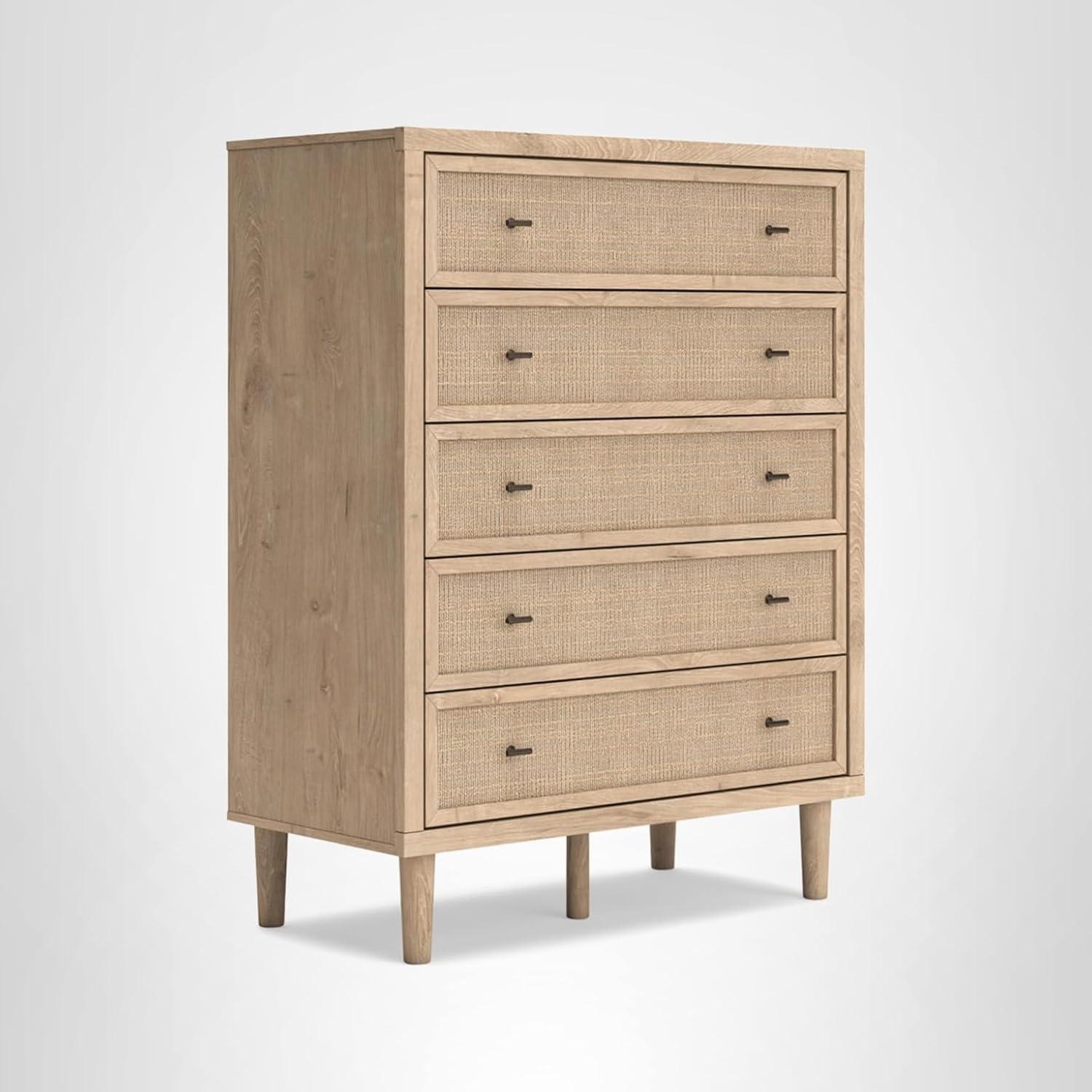 Clean-lined and contemporary—but far from stark—this dresser with mirror is a fresh style awakening. Pairing a light finish with replicated oak grain and textured beige details that replicate the look of cane, its mixed materials bring a naturally versatile vibe to your bedroom. Prepare to have your mind blown by the vast universe of possibilities that await within the spacious drawers. Whether you're prepping for work or getting ready to hit the town, the mirror will have you looking fabulous from every angle.