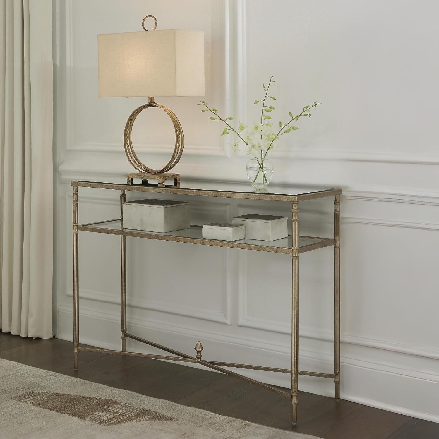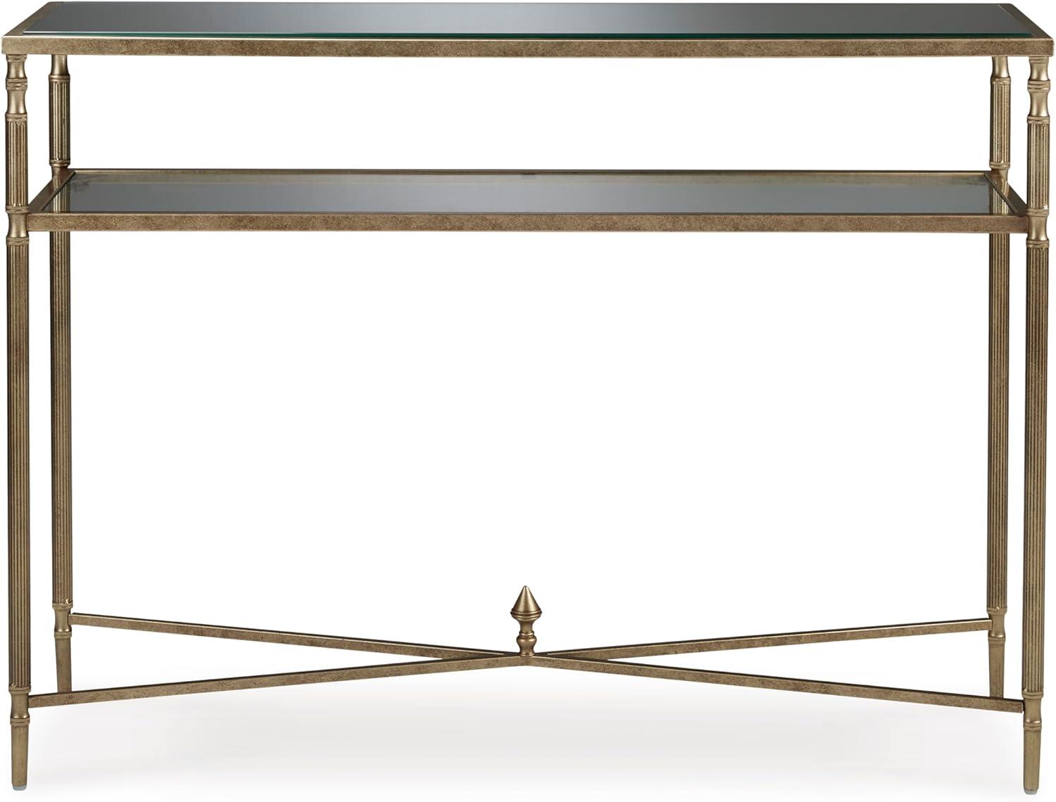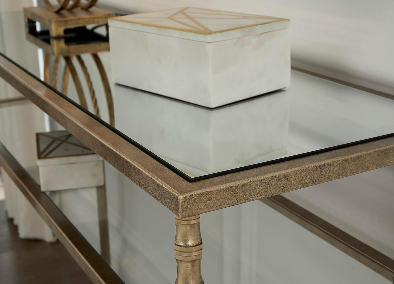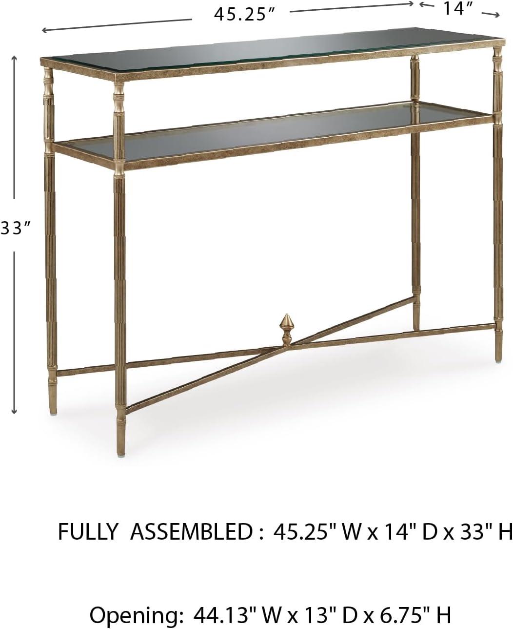 TRADITIONAL SOFA TABLE: This table's details are timeless classics. The aged goldtone coloration is the essence of relaxed elegance. An underlying shelf adds style, substance and functionality