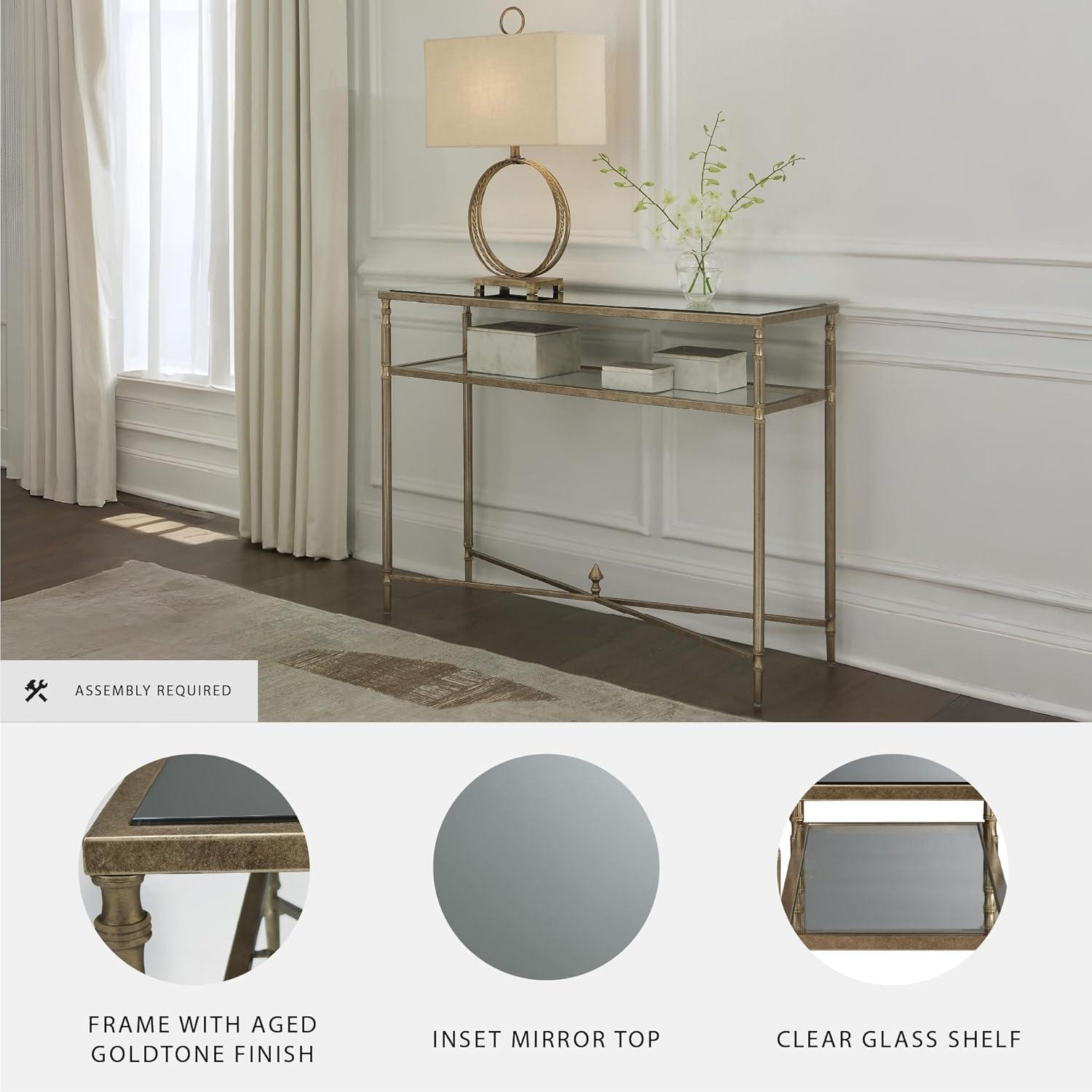 QUALITY CRAFTED: Made with metal & glass with inset mirror top and clear glass shelf. Frame with aged goldtone finish. Legs with bobbins and reeded embellishments. Lower stretcher with center finial