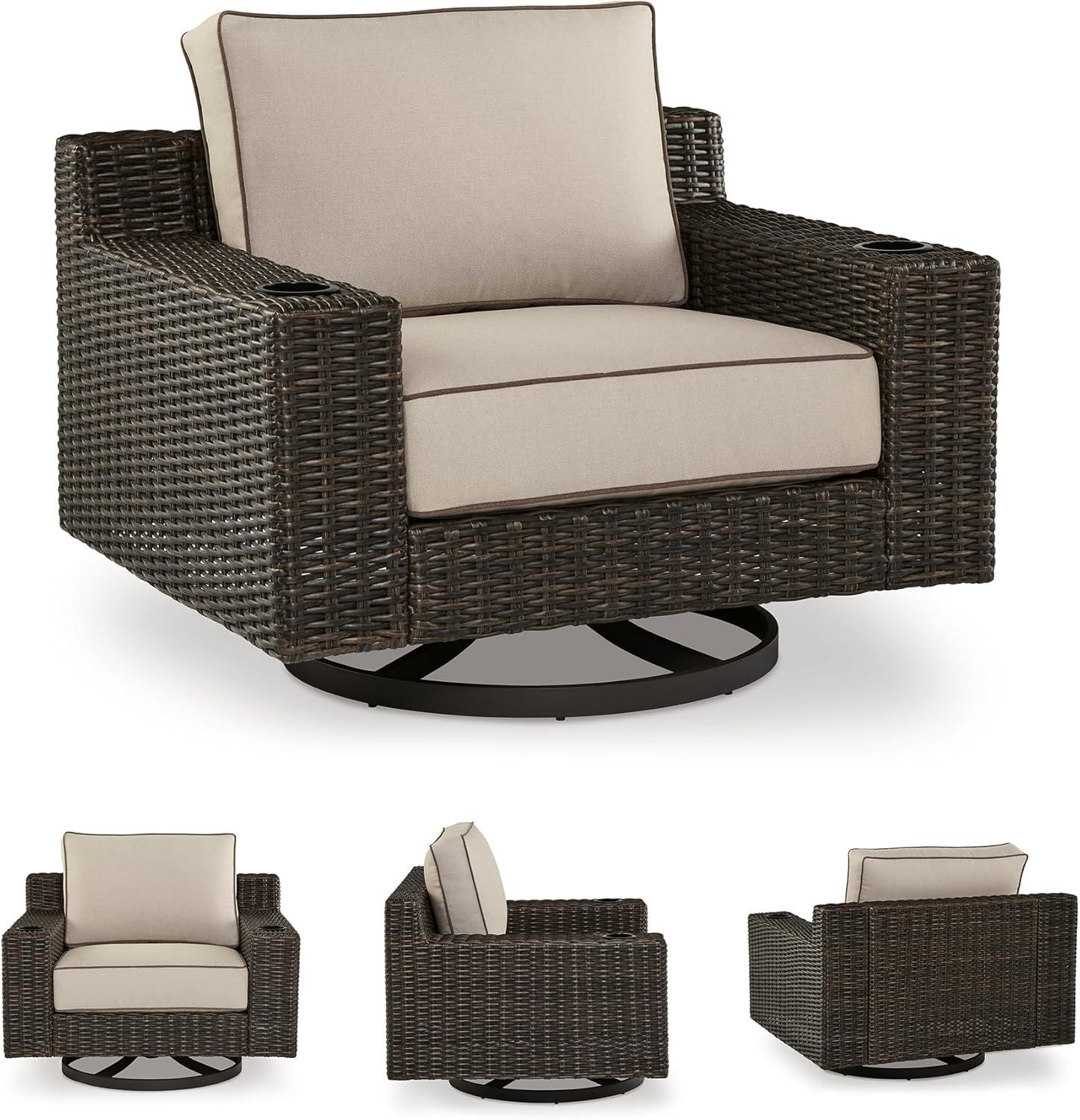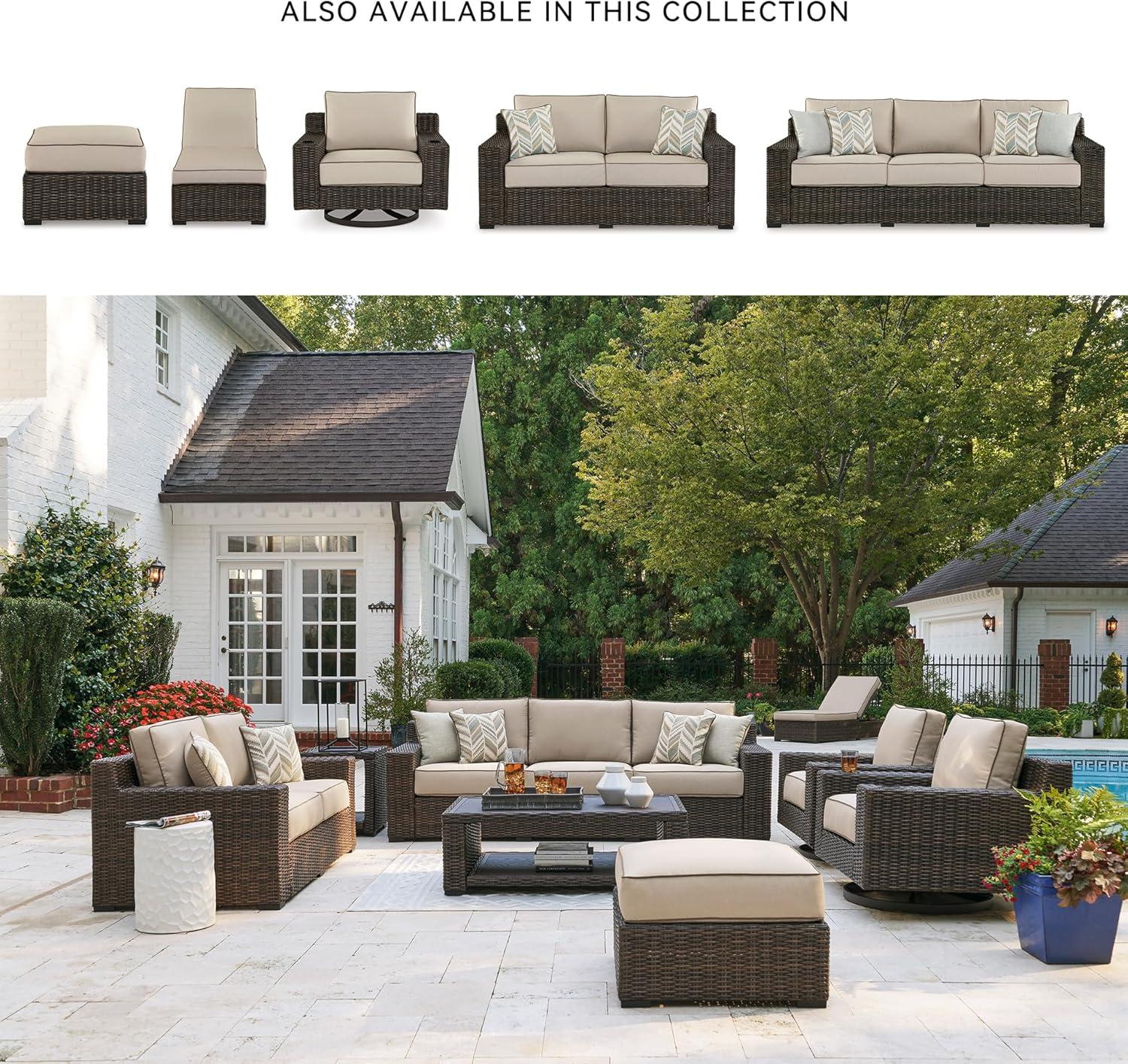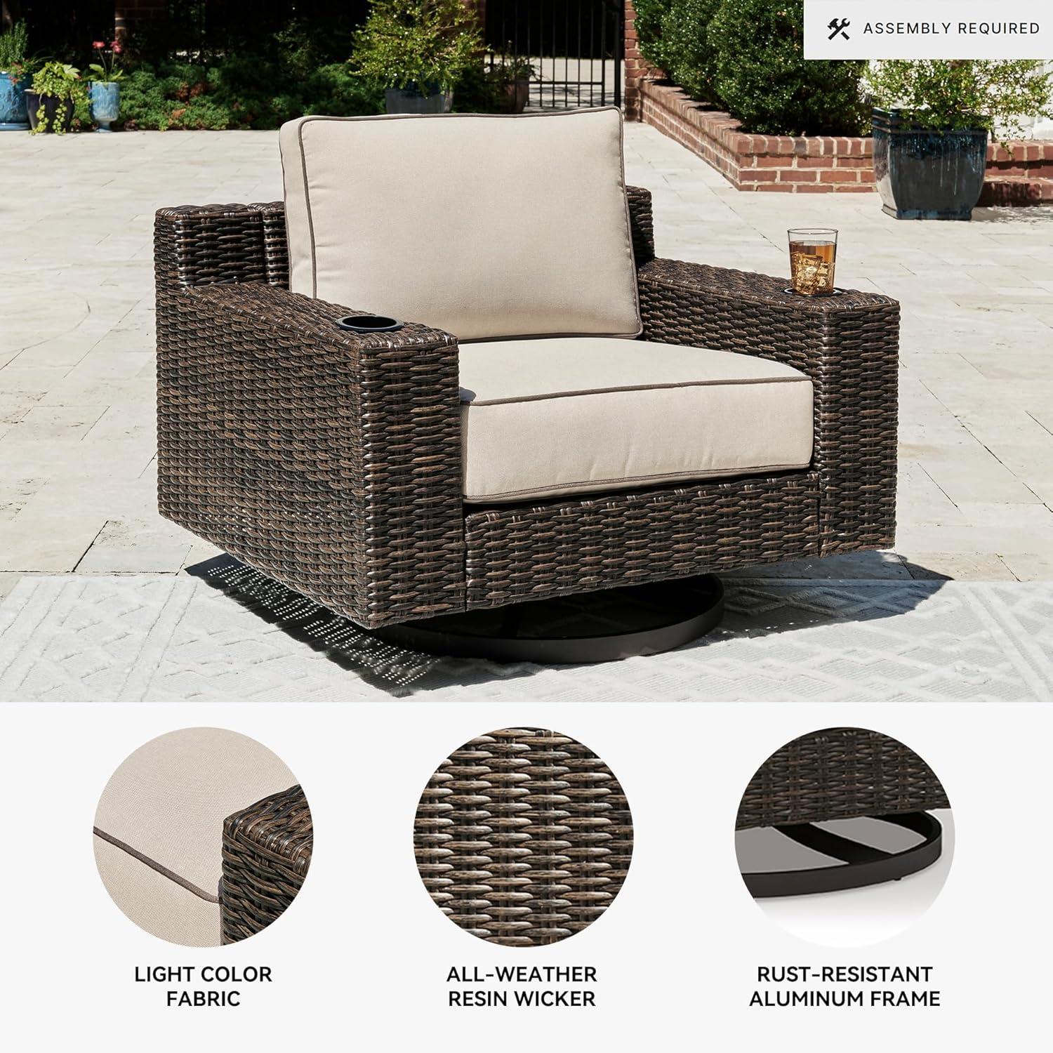Signature Design by Ashley Coastline Bay Casual Weather Resistant Outdoor Loveseat with Cushion and 2 Throw Pillows, Nuvella Weather Resistant Fabric, Beige & Dark Brown(Outdoor Swivel Lounge with Cushion)