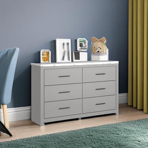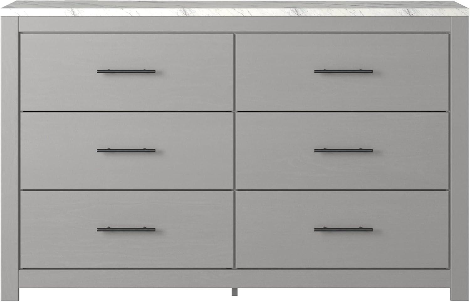 Cool, clean and casually modern. This dresser’s wispy dove gray finish and faux Calcutta marble top set the tone for your calming sanctuary. Large linear pulls add dimension and authenticity. Six smooth-gliding drawers neatly accommodate your wardrobe needs. Whether you need storage space for clothes, linens or toys, you're sure to find the right fit. Your dream bedroom is closer than you think–our wide selection of finishes and features fulfill your decor needs, from casual to contemporary. And we go the extra mile to package, protect and deliver your purchase in a timely manner. Trust us to bring your space to life with furniture and decor that show off your style and personality.