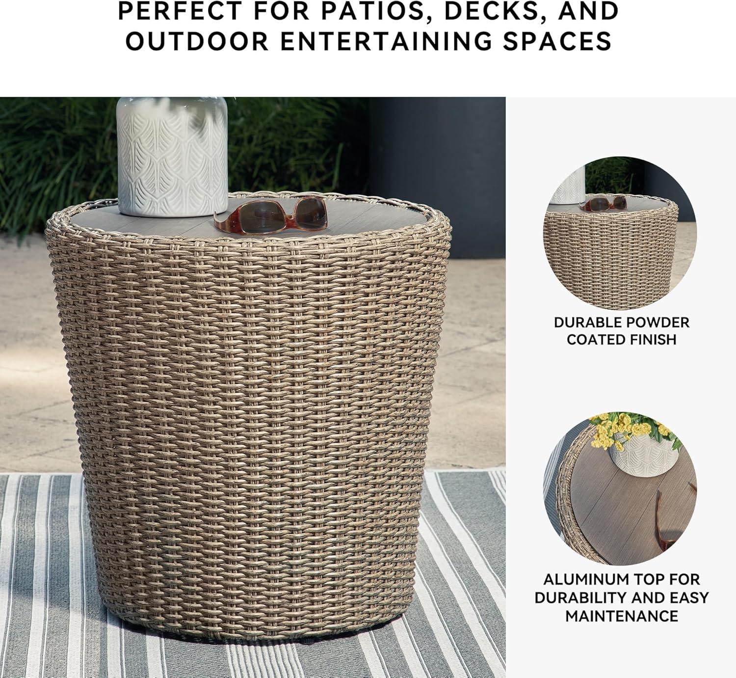 This end table completes your outdoor seating area with its fresh take on casual comfort. Handwoven resin wicker over a curving frame balances streamlined style and exceptional durability. An aluminum top polishes off the piece, acting as a perfect perch for snacks, beverages and decor. With patio chairs and tables, you have all the ingredients needed for an engaging, fun-filled evening flavored with plenty of entertainment. For the very best in value, selection and price, we're your go-to destination for the finest in elegant alfresco living. Trust us to bring your space to life with furniture and decor that show off your style and personality.