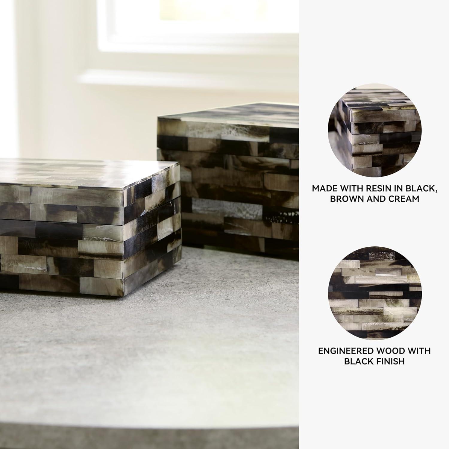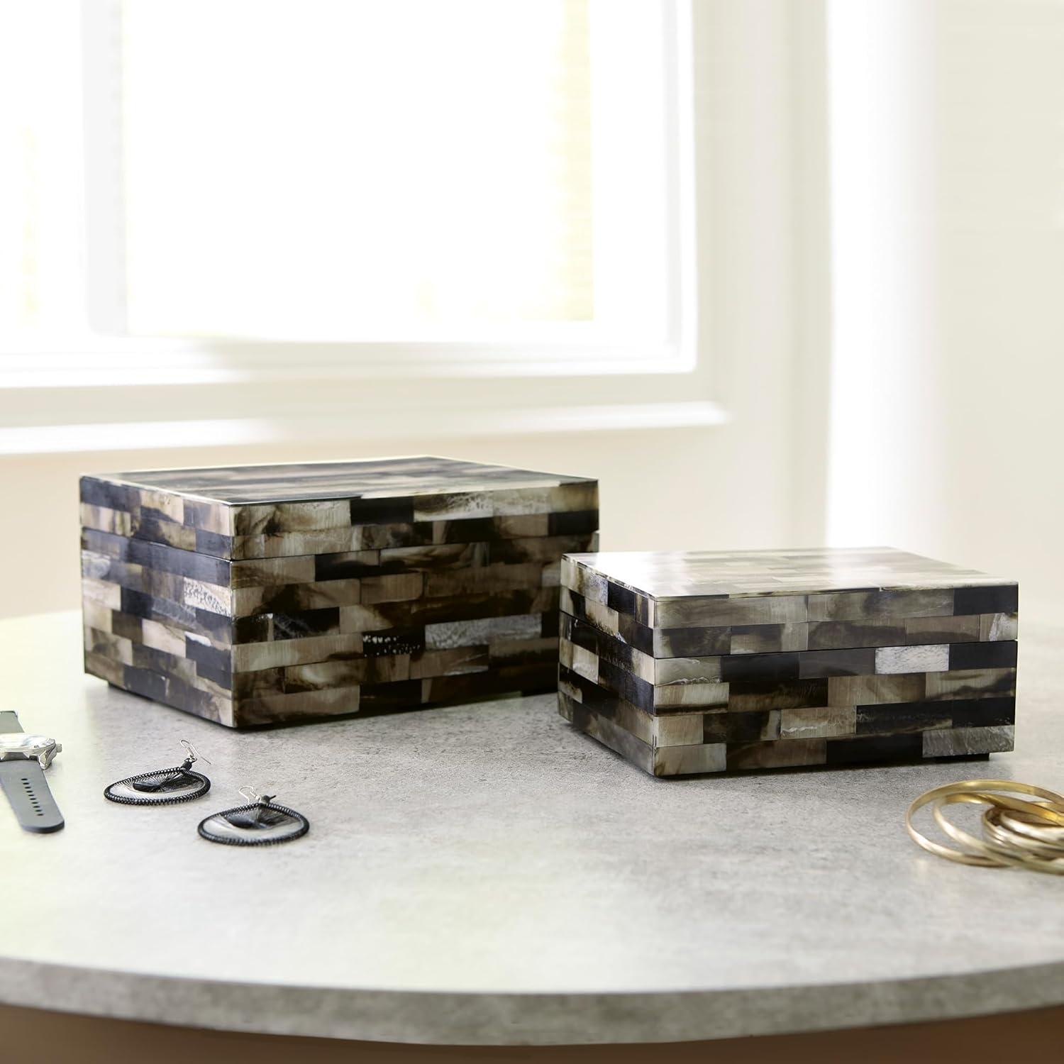 SET OF 2 BOXES: This mosaic-patterned box set is a masterful interpretation of neutral hues. Keeping clutter off the top of your dresser or accent table has never been so stylish