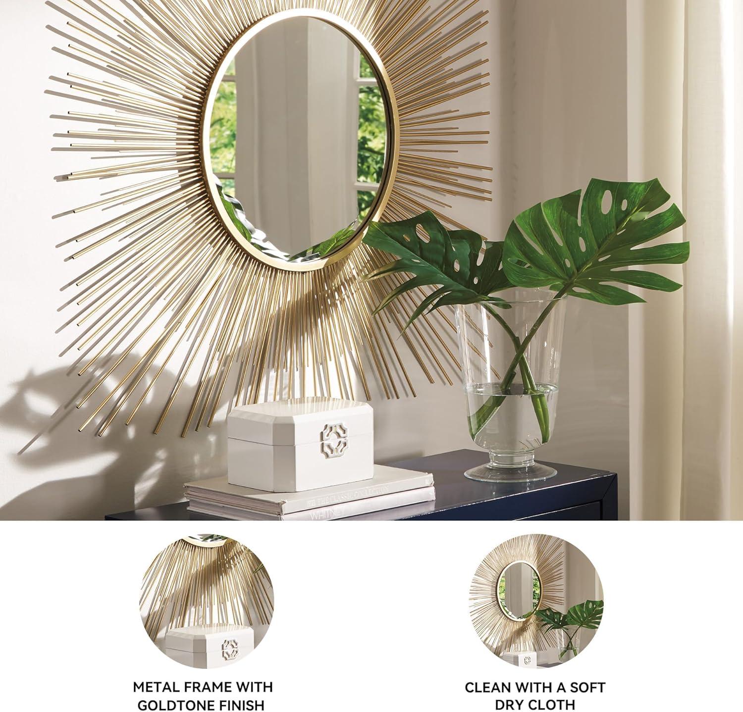 This accent mirror is a contemporary musing. Breathtaking sunburst design shines in goldtone metal. Beautifully large scale makes this piece the center of attention. Home decorations are the details that bring your room to life. From sculptures to baskets, bowls and trays, these items add beauty to your home, regardless of your style. If you’re wanting an easy way to spruce up or transform the look of your room, you might consider adding a modern vase to your end table or a unique piece of wall decor. You could put ornate candle holders in your dining room. Or traditional boxes on your armoire. Whether you need to infuse some storage for your throws with boxes or baskets or add some color with decorative vases or bottles, we can help create a space to reflect your style through your room decor.