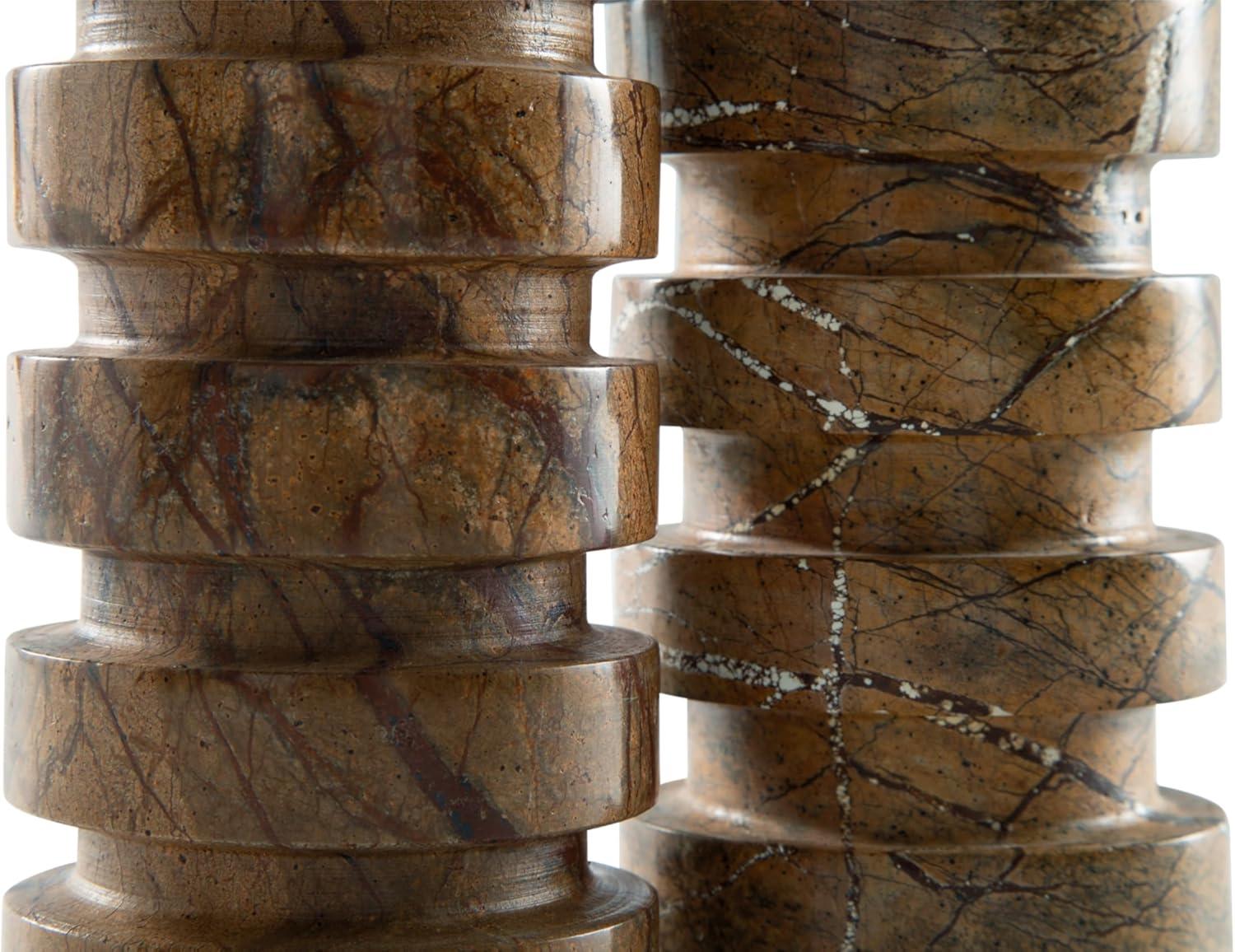 SET OF 2 CANDLE HOLDERS: Add a soft glimmer to counters and tables with this candle holder set. These contemporary tan marble accent pieces exude a sense of earthy elegance