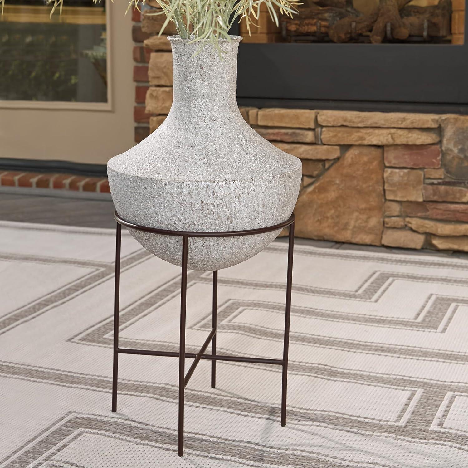 Take an effortlessly inviting approach to floor decor. This vase's distressed, textured look in a neutral hue pairs with a variety of casual color palettes. An espresso brown stand adds charming contrast to the look. And this vase enthusiastically welcomes faux florals and filler, perfectly adapting to the seasons when you swap out your arrangements.