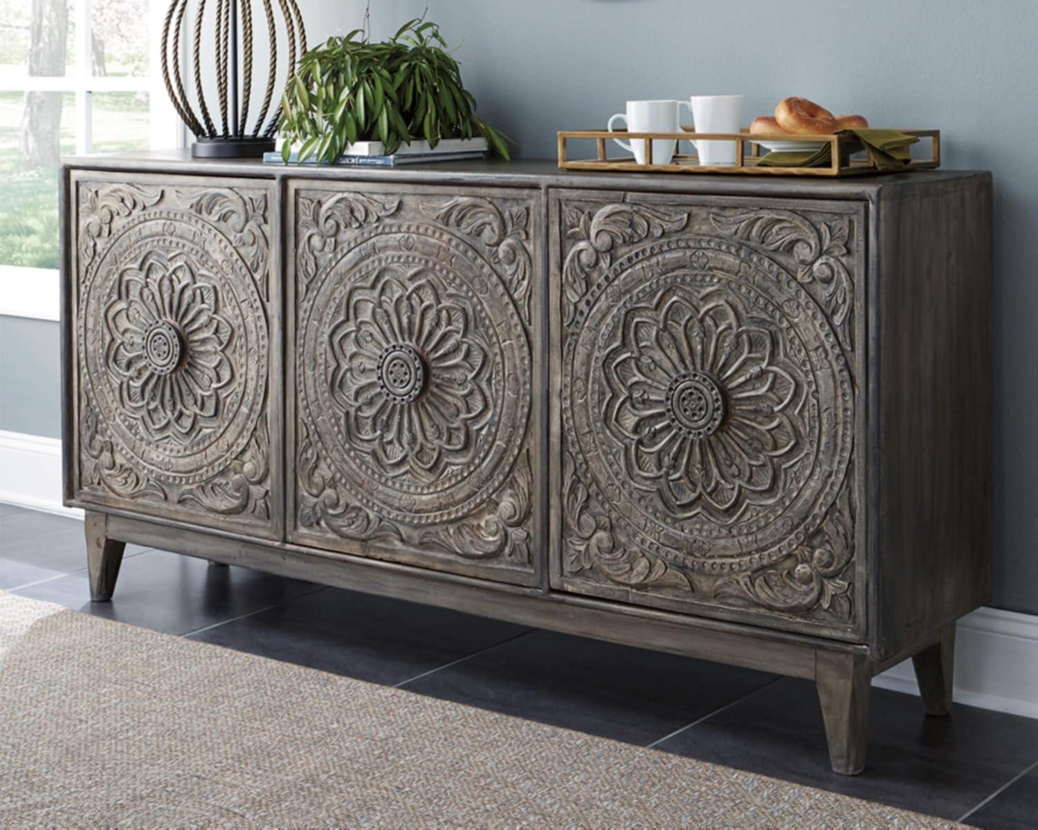 Signature Design by Ashley Fair Ridge Boho Hand Carved Wood Accent Cabinet or TV Stand, Dark Gray