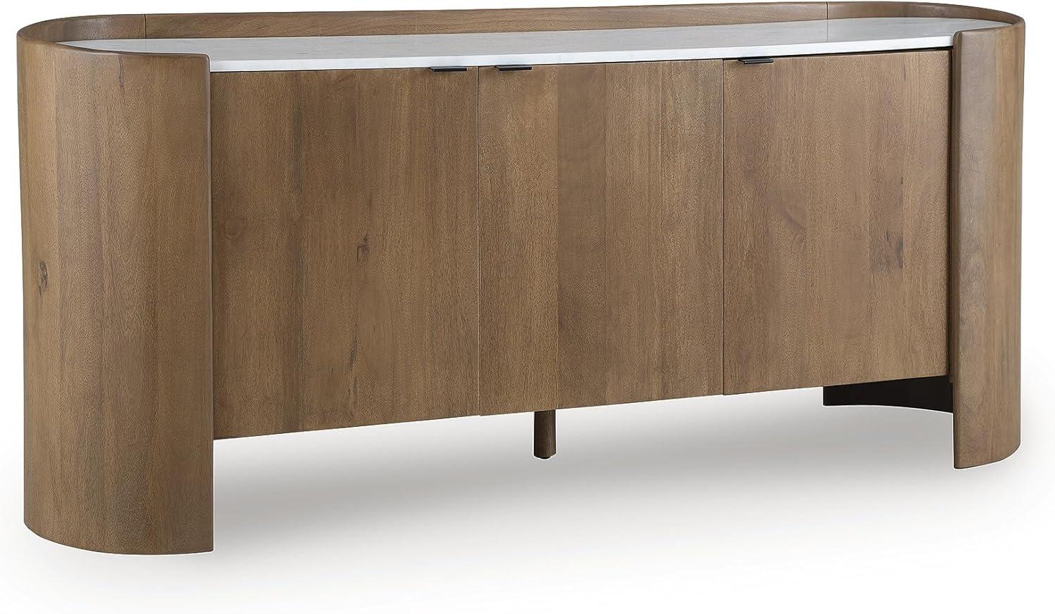 This stunning accent cabinet combines modern design with sophisticated materials. Its natural finish and sleek white marble top create an elegant contrast, while the unique rounded silhouette adds a touch of contemporary flair. Three doors open to reveal shelves and storage space, making this piece as practical as it is beautiful.