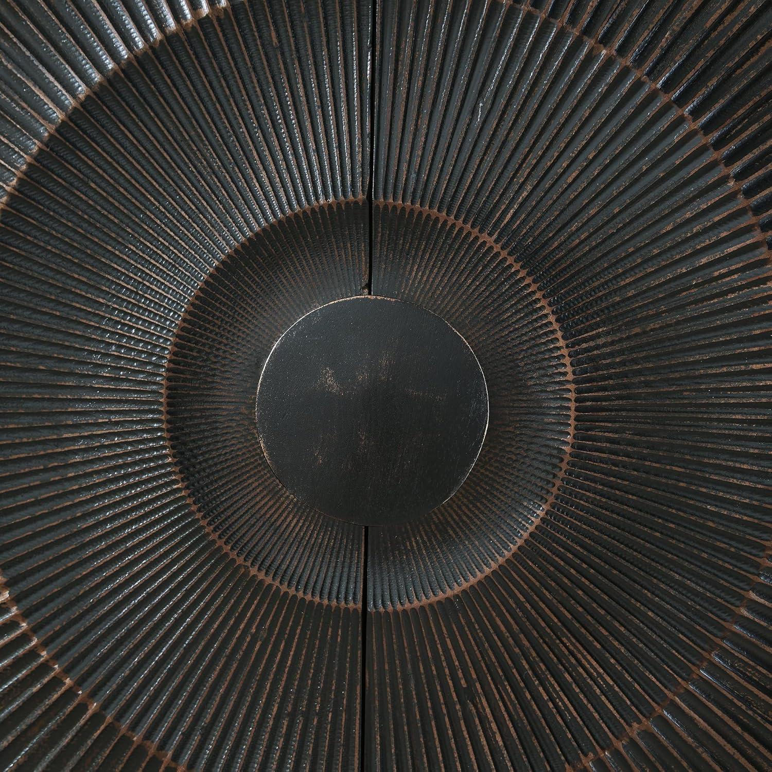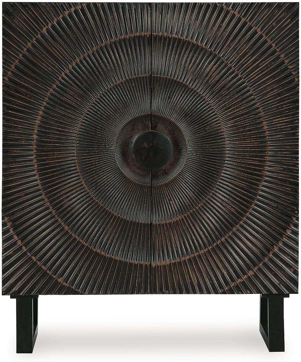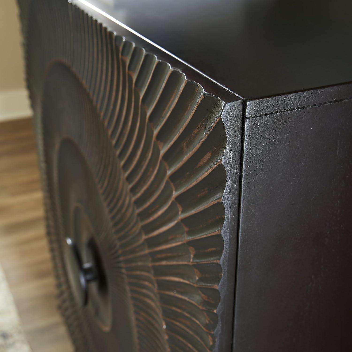 High style is on the rise with this wood accent cabinet. Its stunning doors, graced with a carved sunburst pattern and oversized wood pull, open to reveal two shelves. A distressed black finish adds contemporary flair. Whether this cabinet is accommodating storage needs or hiding clutter, it's truly a showpiece.