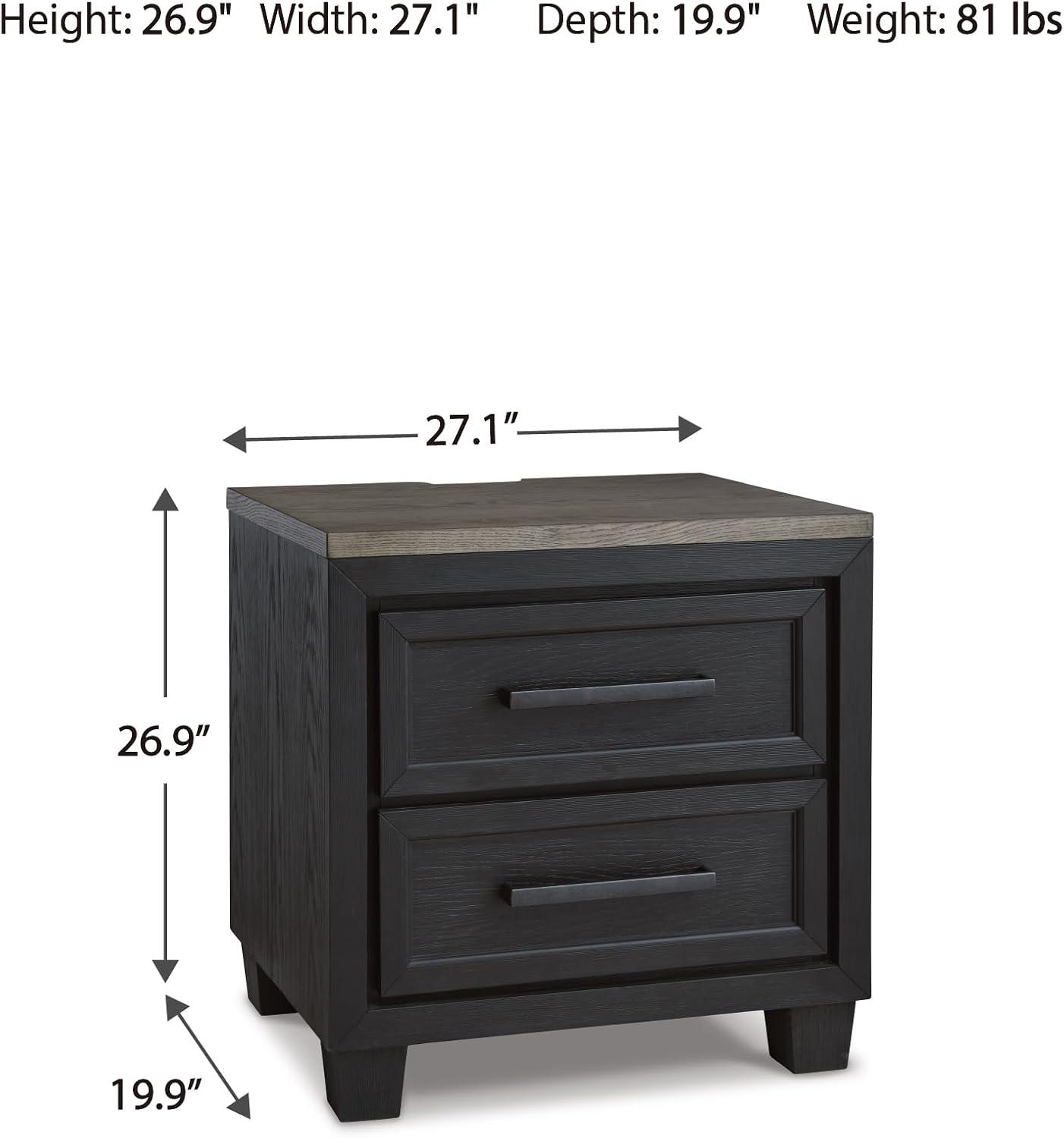 This nightstand is casual contemporary style simply done right. Its two-tone color scheme features a rich brushed black main color accented with a beautiful dusty grayish brown wood tone. Two drawers with sleek black pulls offer plenty of storage for your bedside essentials. The nightstand marries tech and clean-lined design, with a dual USB charging port along the upper back edge to keep your devices powered all evening long.