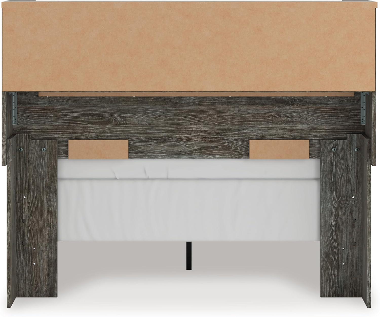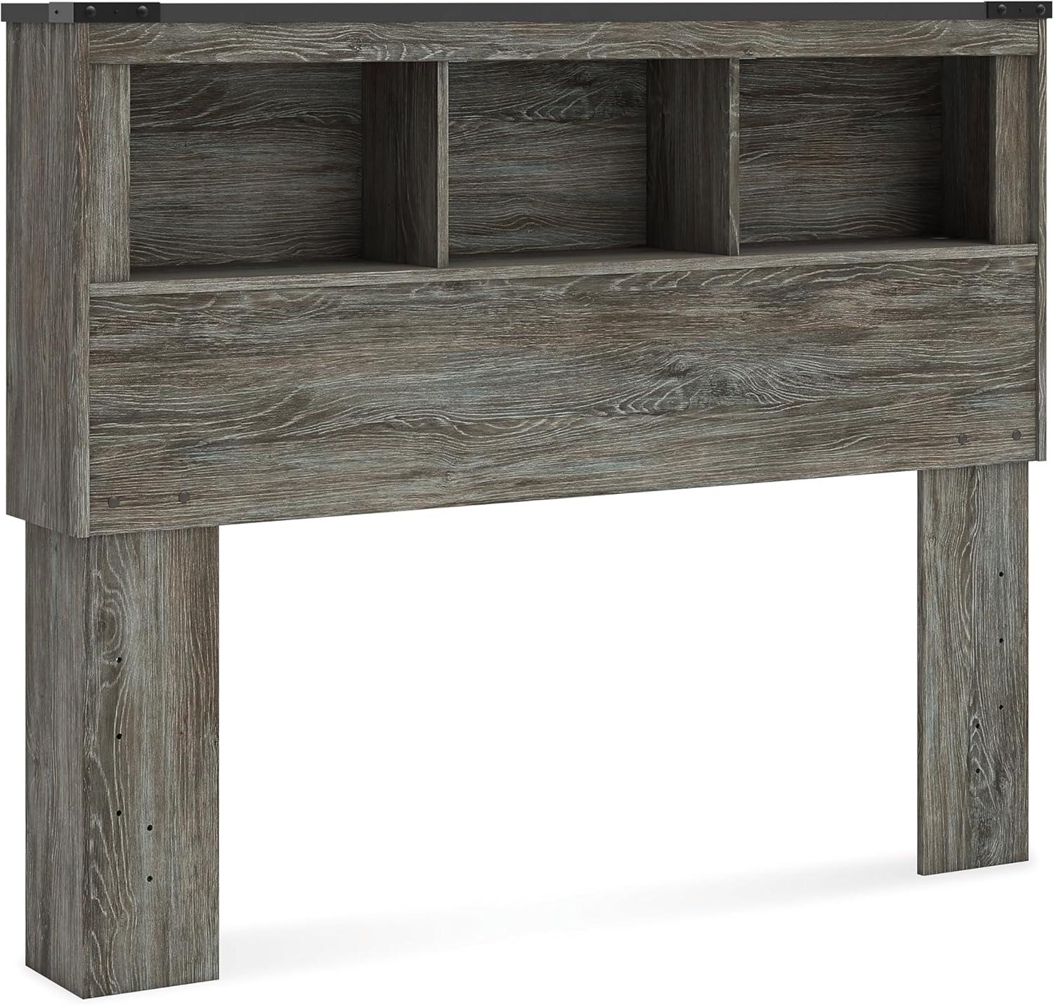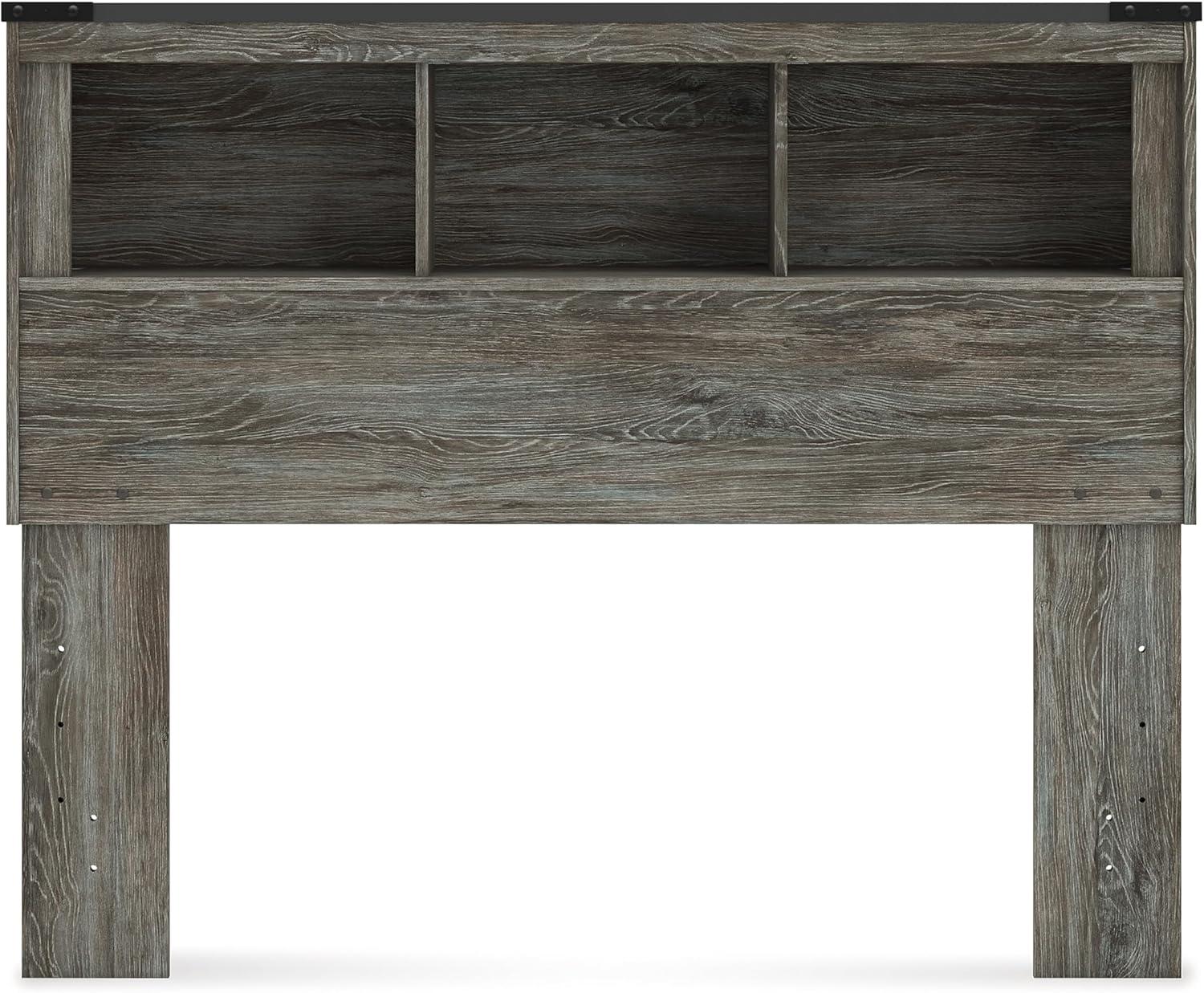 QUALITY CRAFTED: Made with engineered wood and decorative laminate. Rustic warm gray finish over replicated oak grain. 3 storage cubbies. ¼” bolts (not included) are needed to attach headboard to existing bed frame