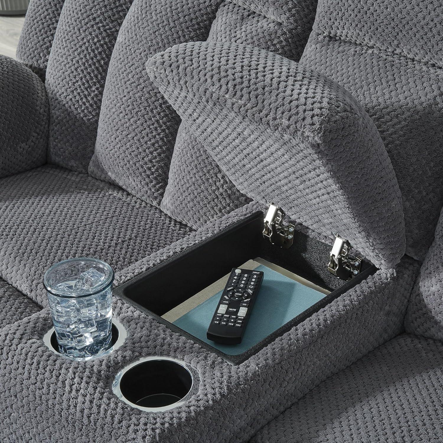 QUALITY MADE: One-touch power control with adjustable positions and USB charging. Corner-blocked frame with metal reinforced seat. High-quality foam cushions wrapped in poly fiber. Polyester upholstery. Console with 2 cup holders and hidden storage