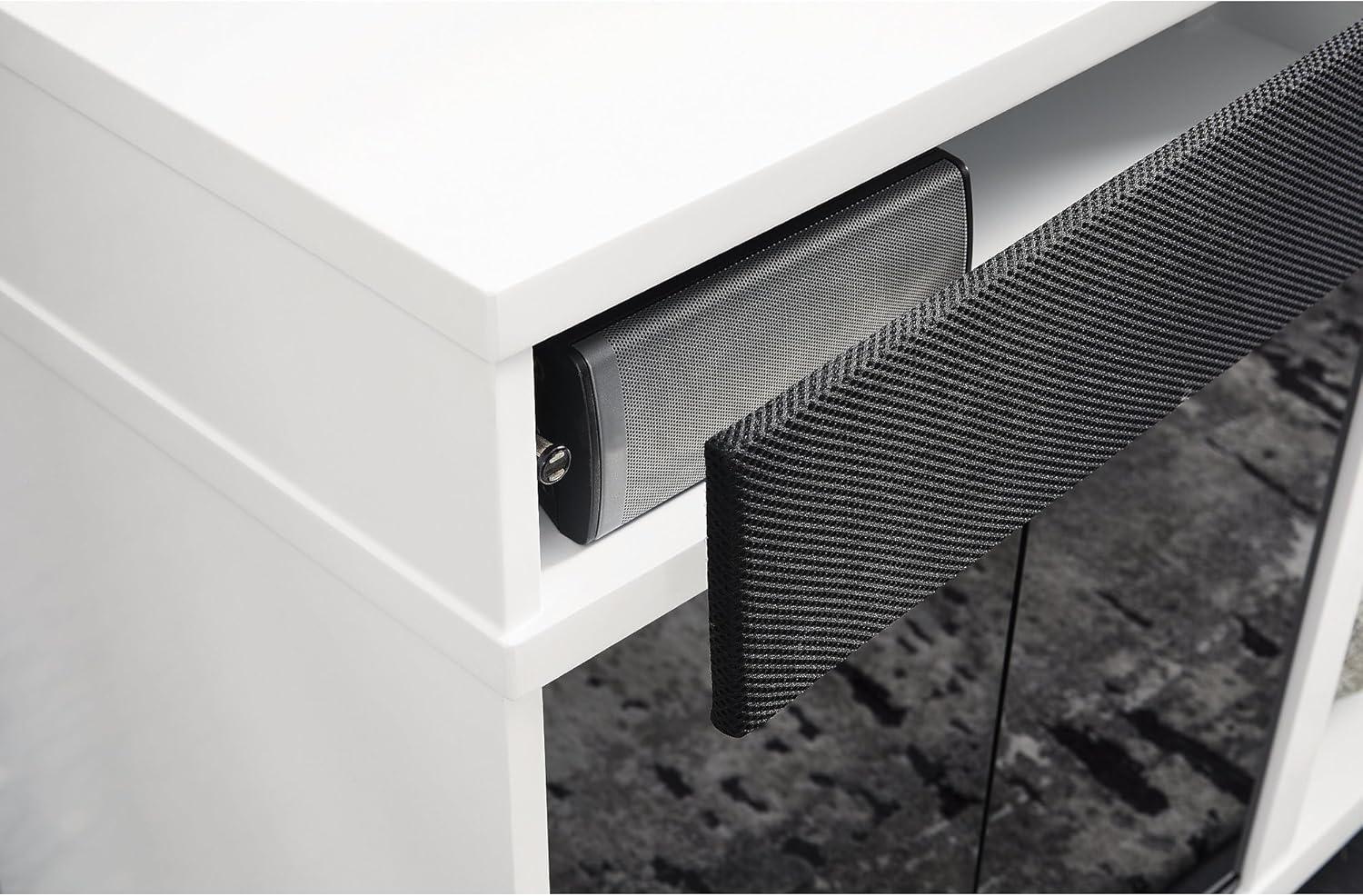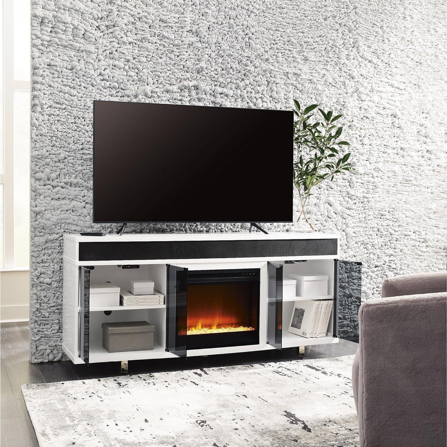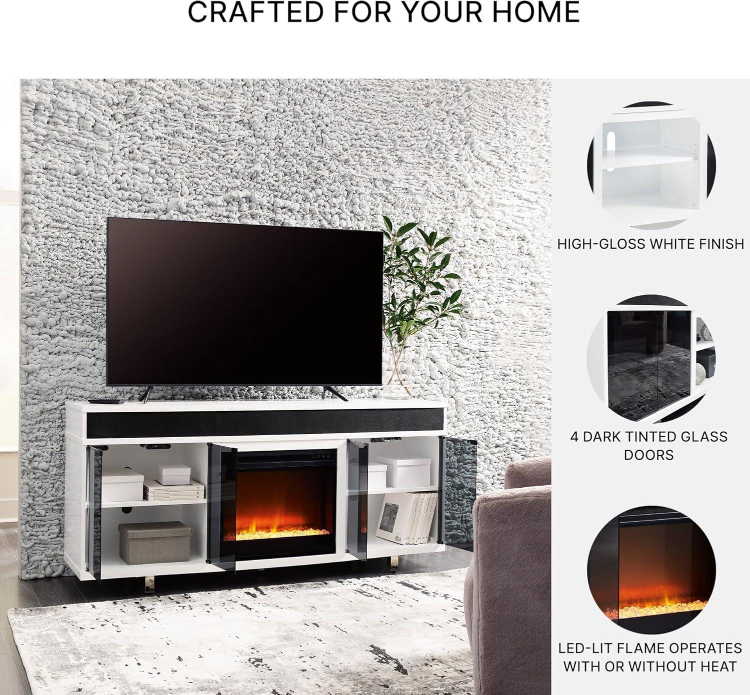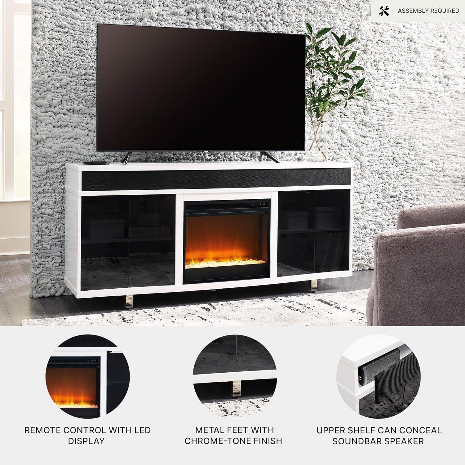 Combining a white high-gloss finish with black glass doors, this TV stand proves opposites really do attract. It's the perfect blend of modern style and functionality, with ample space for your media devices, flat-screen TV and soundbar. Adding that much more show-stopping style, the electric fireplace insert operates with or without heat and includes a six-level temperature setting, a remote control and an overheating control for added safety. It comes with faux glass crystals and natural stones, so you can customize the look of the flame bed.
