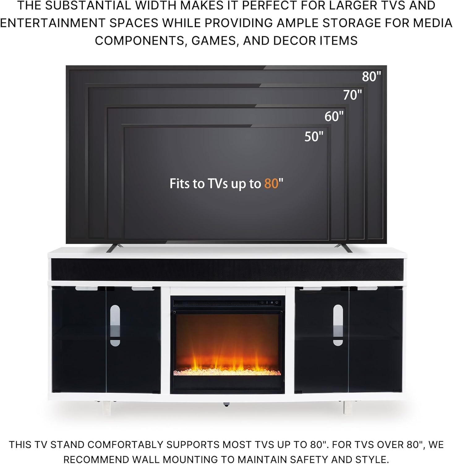 72″ TV STAND WITH ELECTRIC FIREPLACE: Opposites attract with a white high-gloss finish & black glass doors. A blend of modern style & function with ample media space. The fireplace has 6 temp settings, a remote & a customizable flame bed