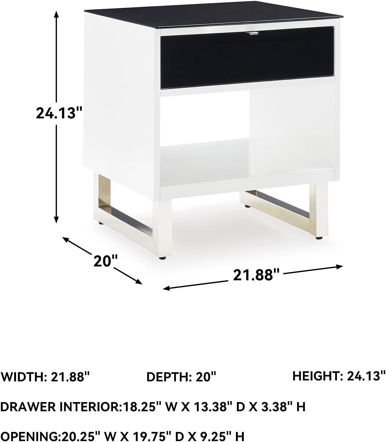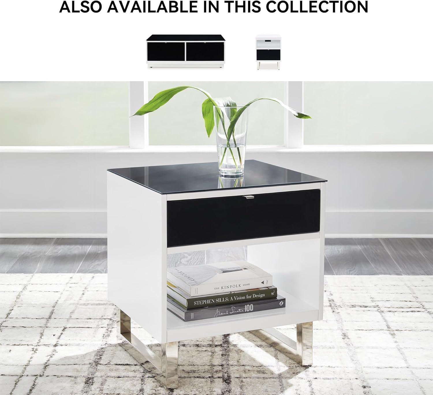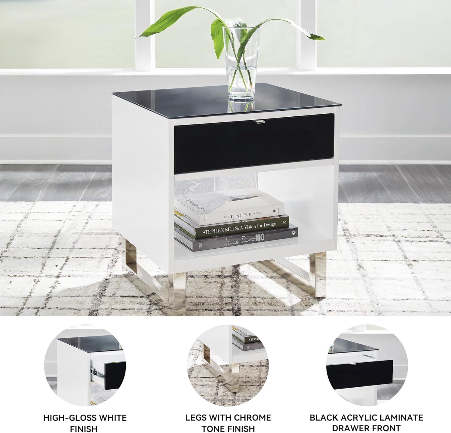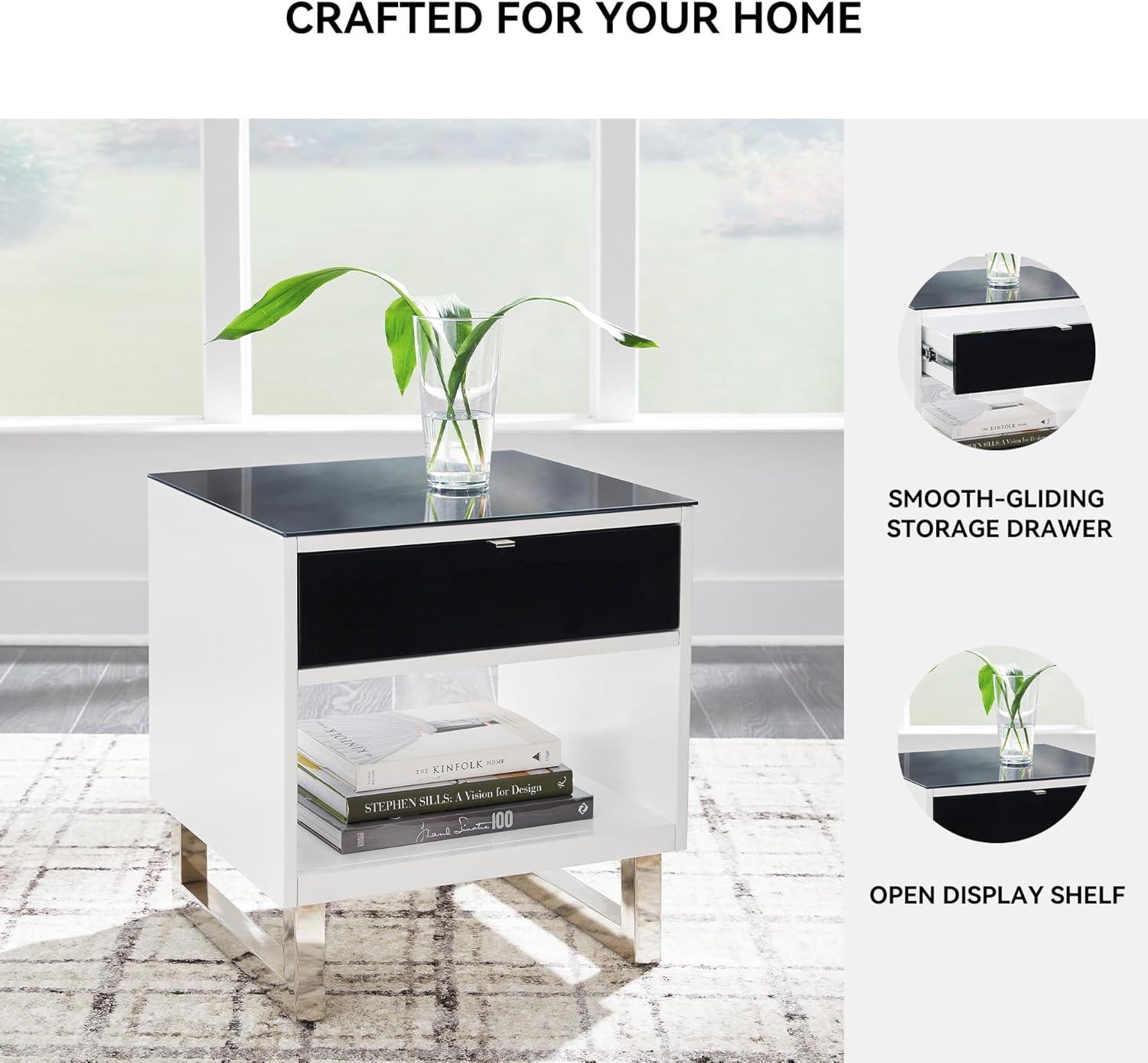Signature Design by Ashley Gardoni Modern Glass-Tabletop End Table with 1 Drawer, Open Shelf, and High Gloss Finish, White & Black