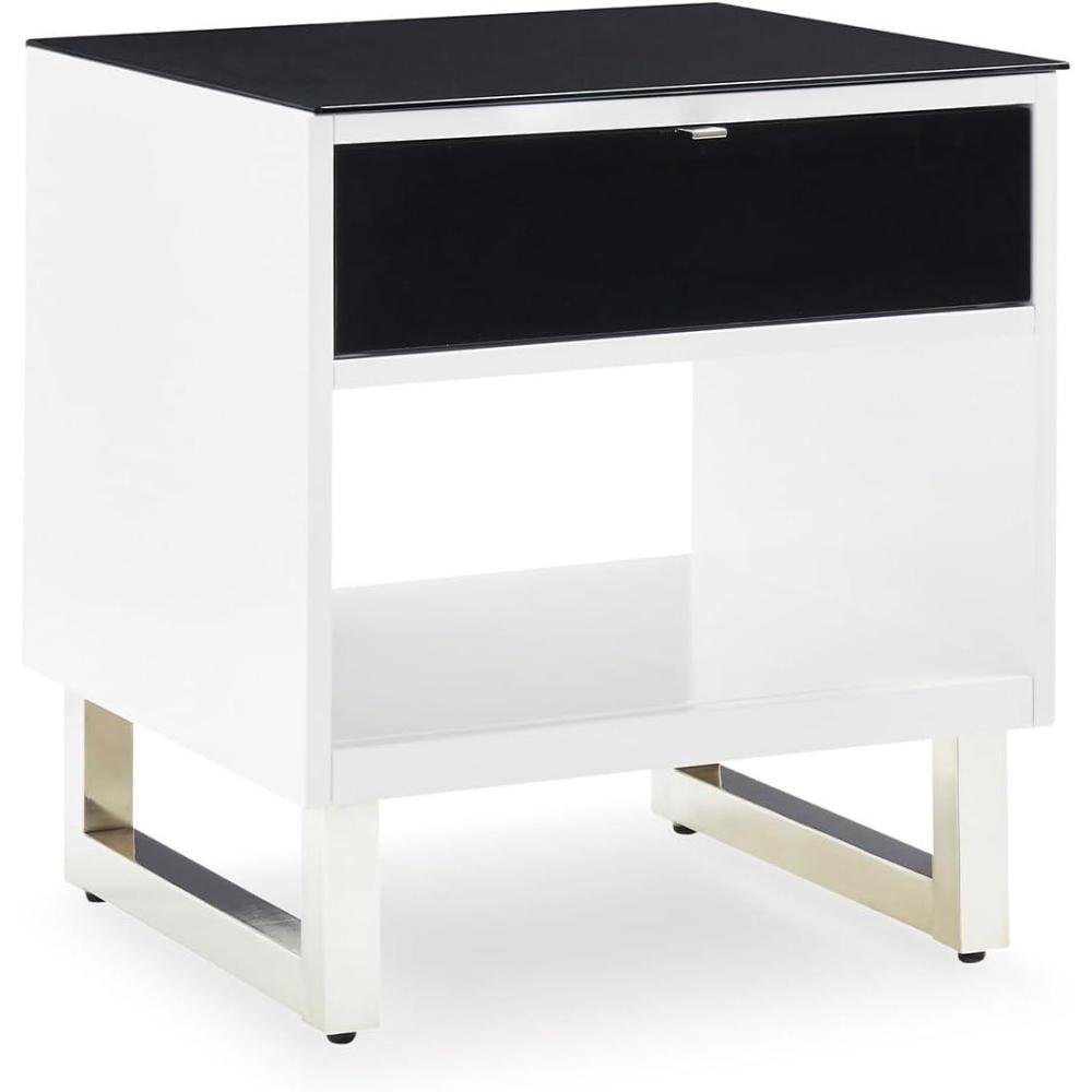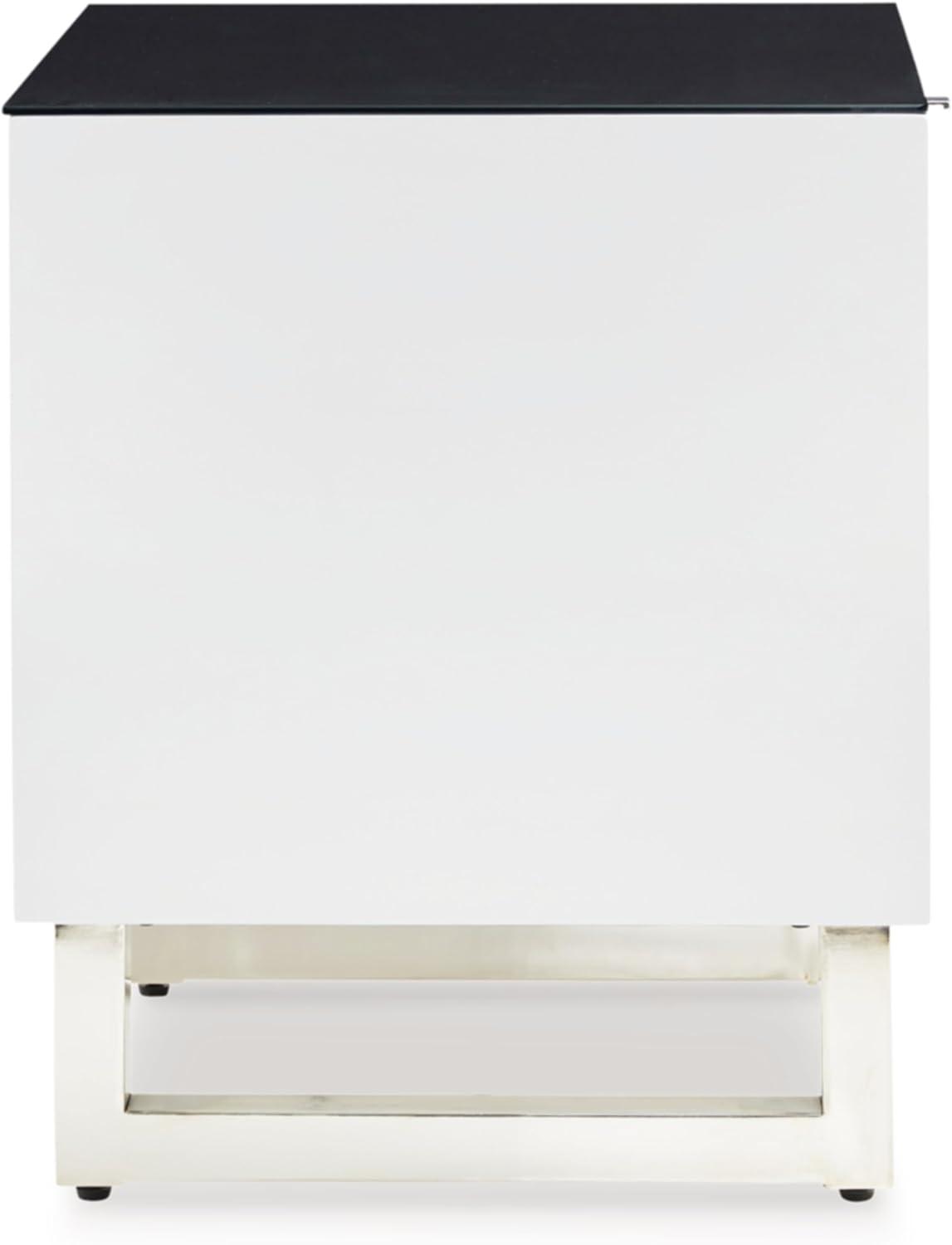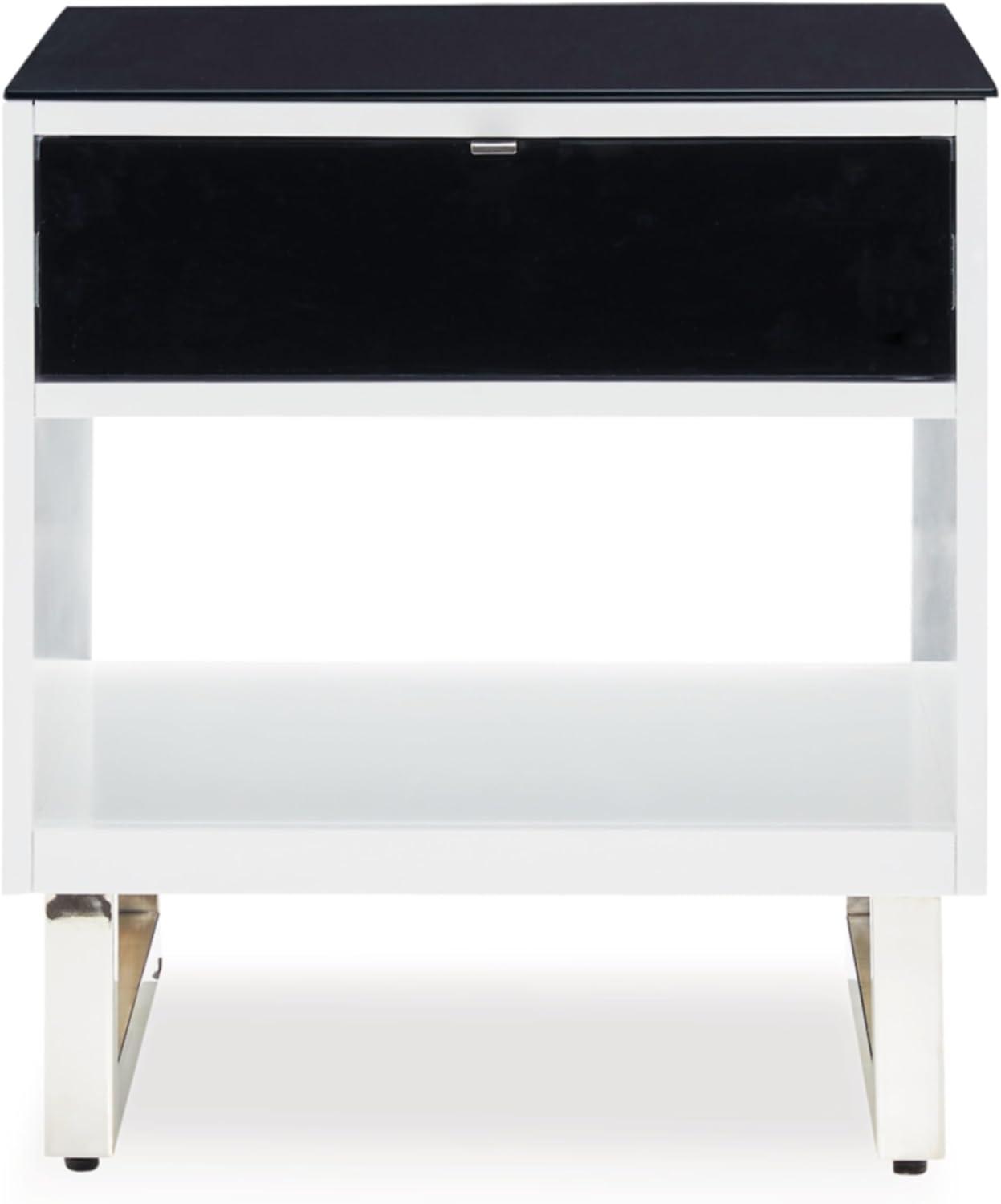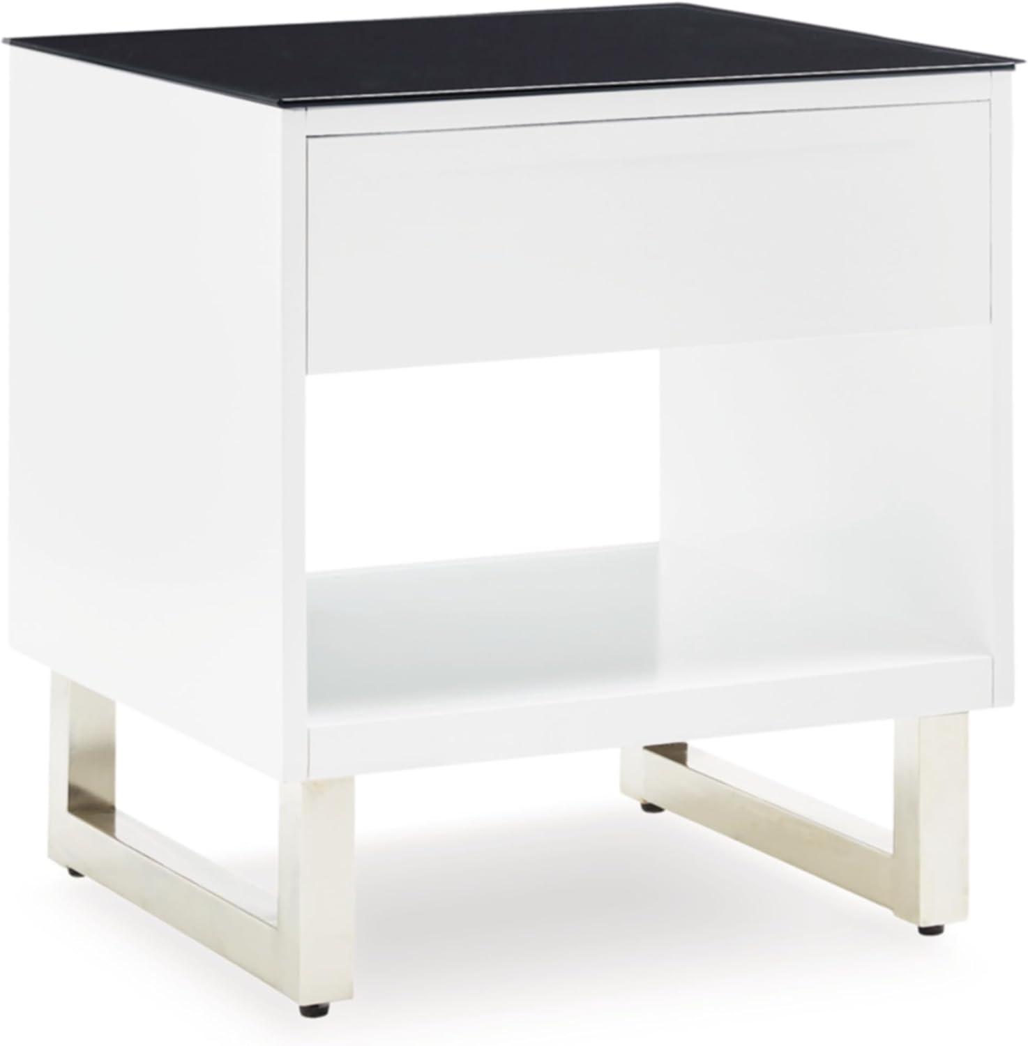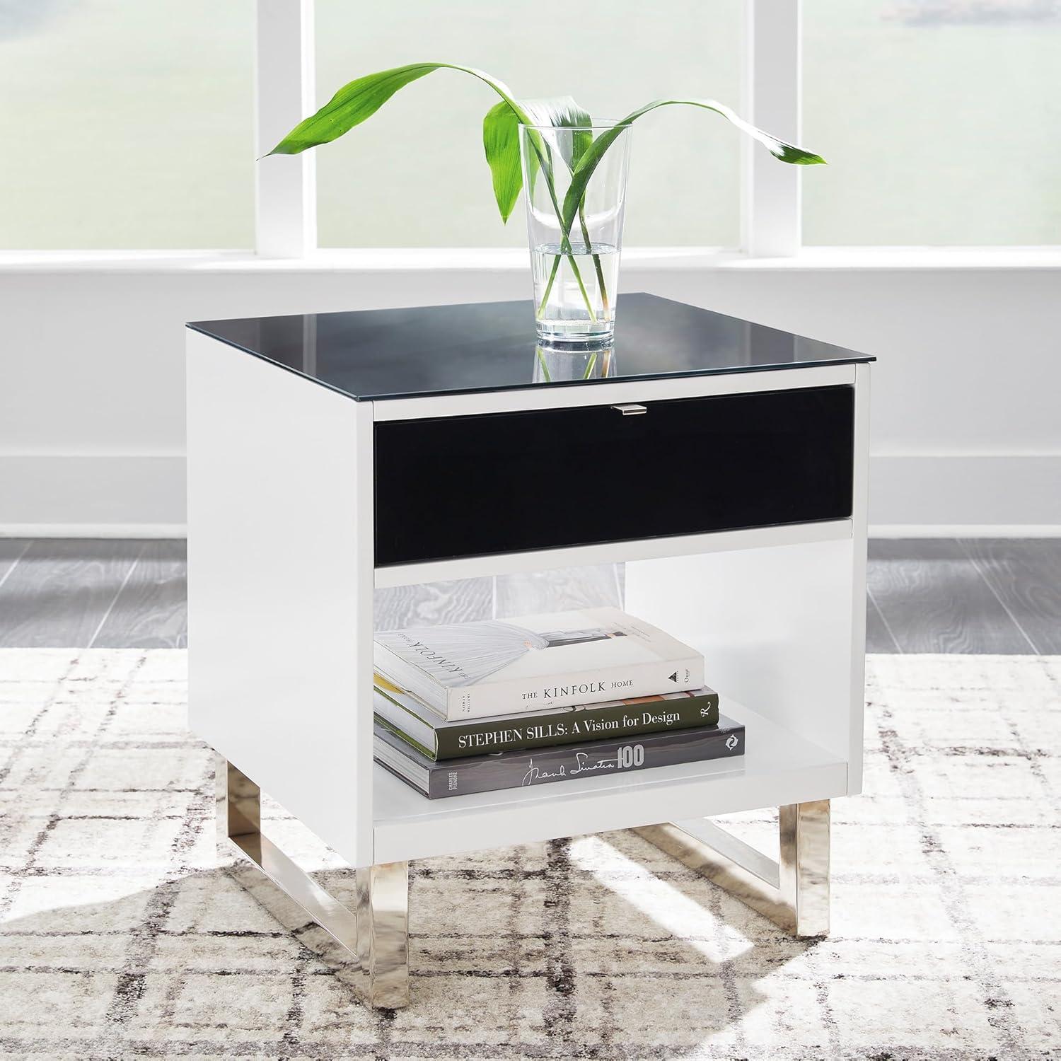 Signature Design by Ashley Gardoni Modern Glass-Tabletop End Table with 1 Drawer, Open Shelf, and High Gloss Finish, White & Black